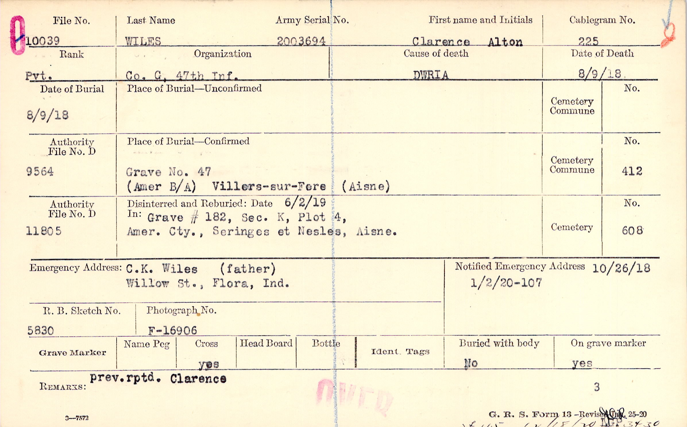 C.K. Wiles (father), Willow St., Flora, Ind.