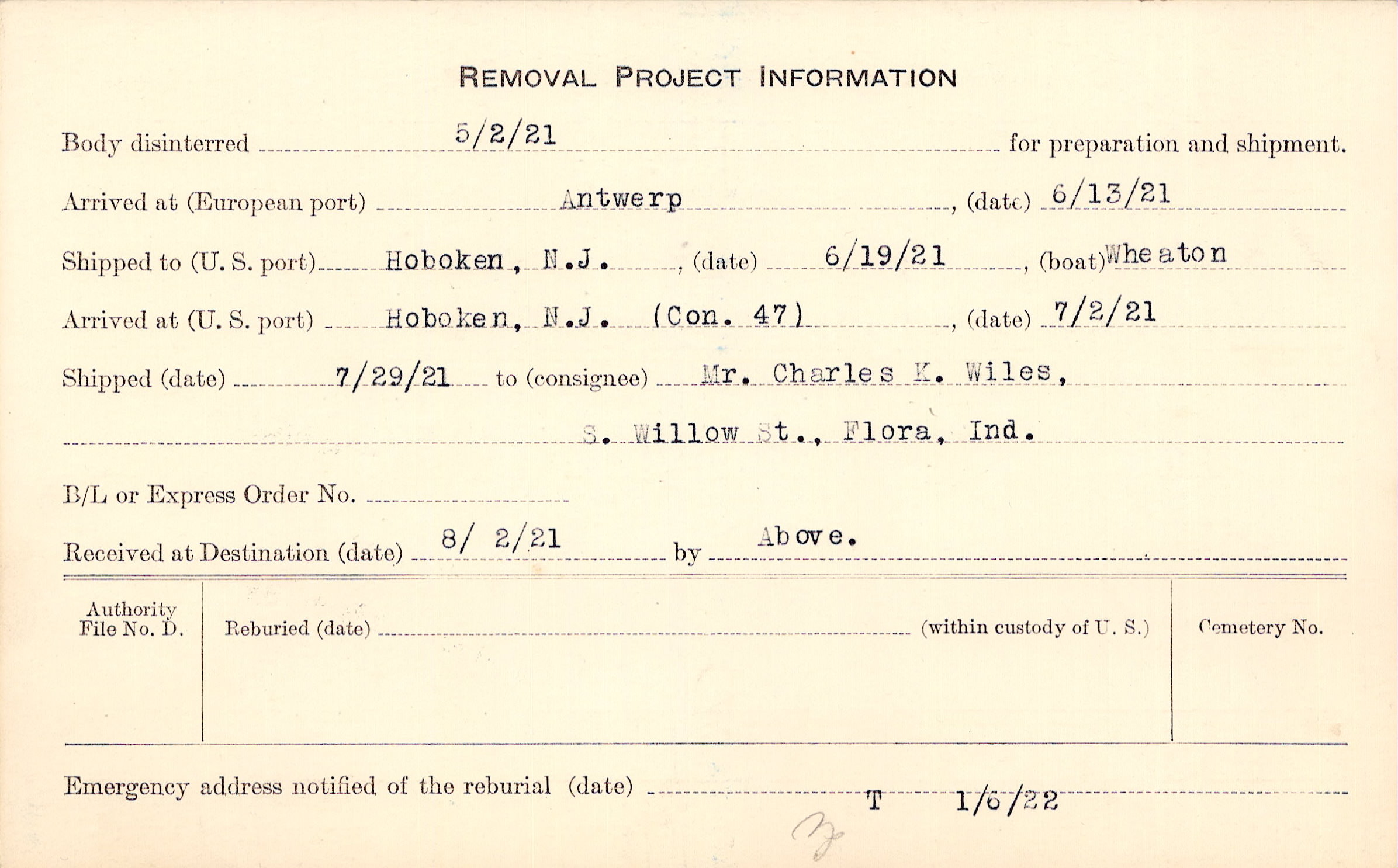 Body disinterred 5/2/1921 for preparation and shipment.