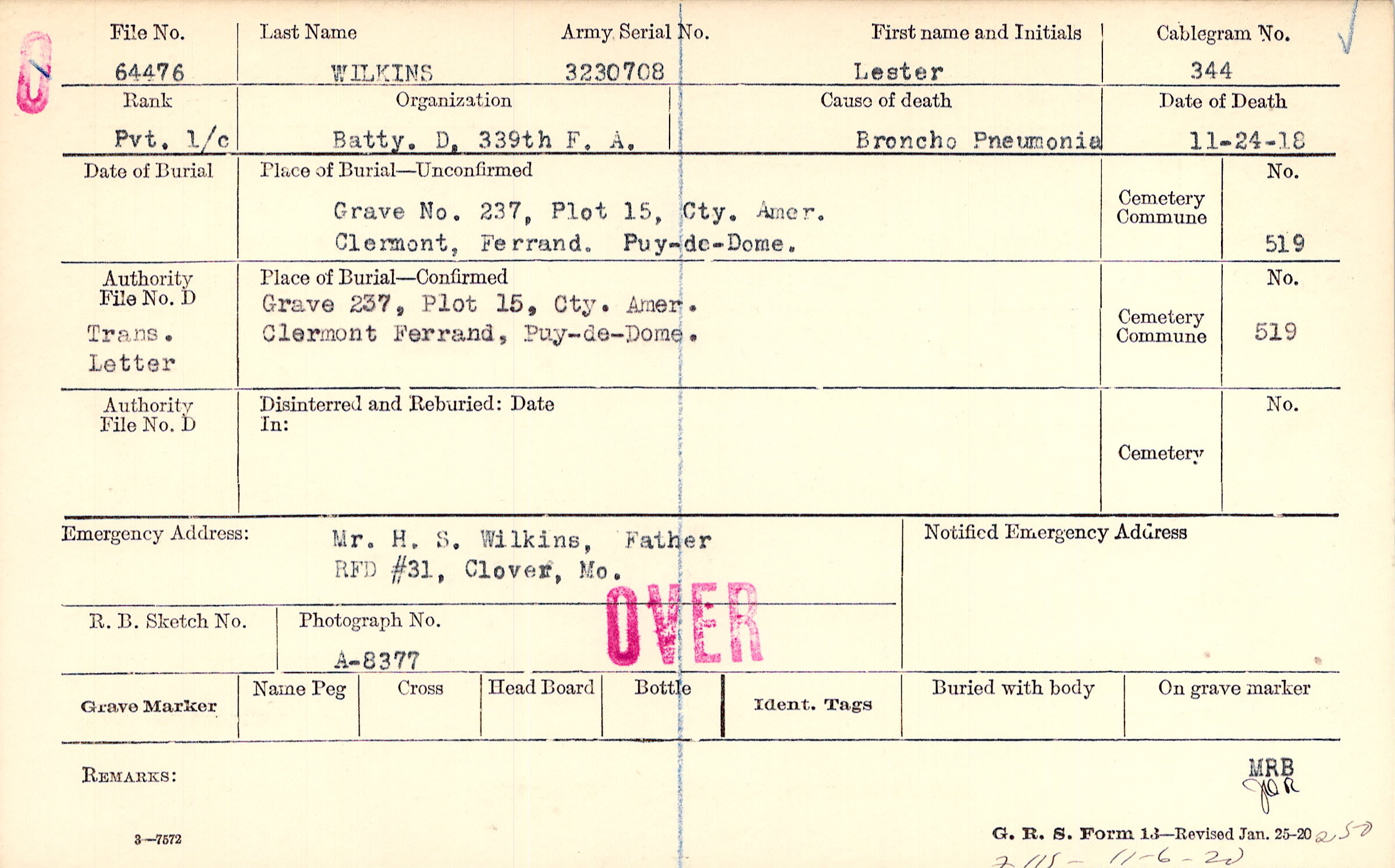 Grave No. 237, Plot 15, Cty. Amer. Clermont, Ferrand., Puy-de-Dome.