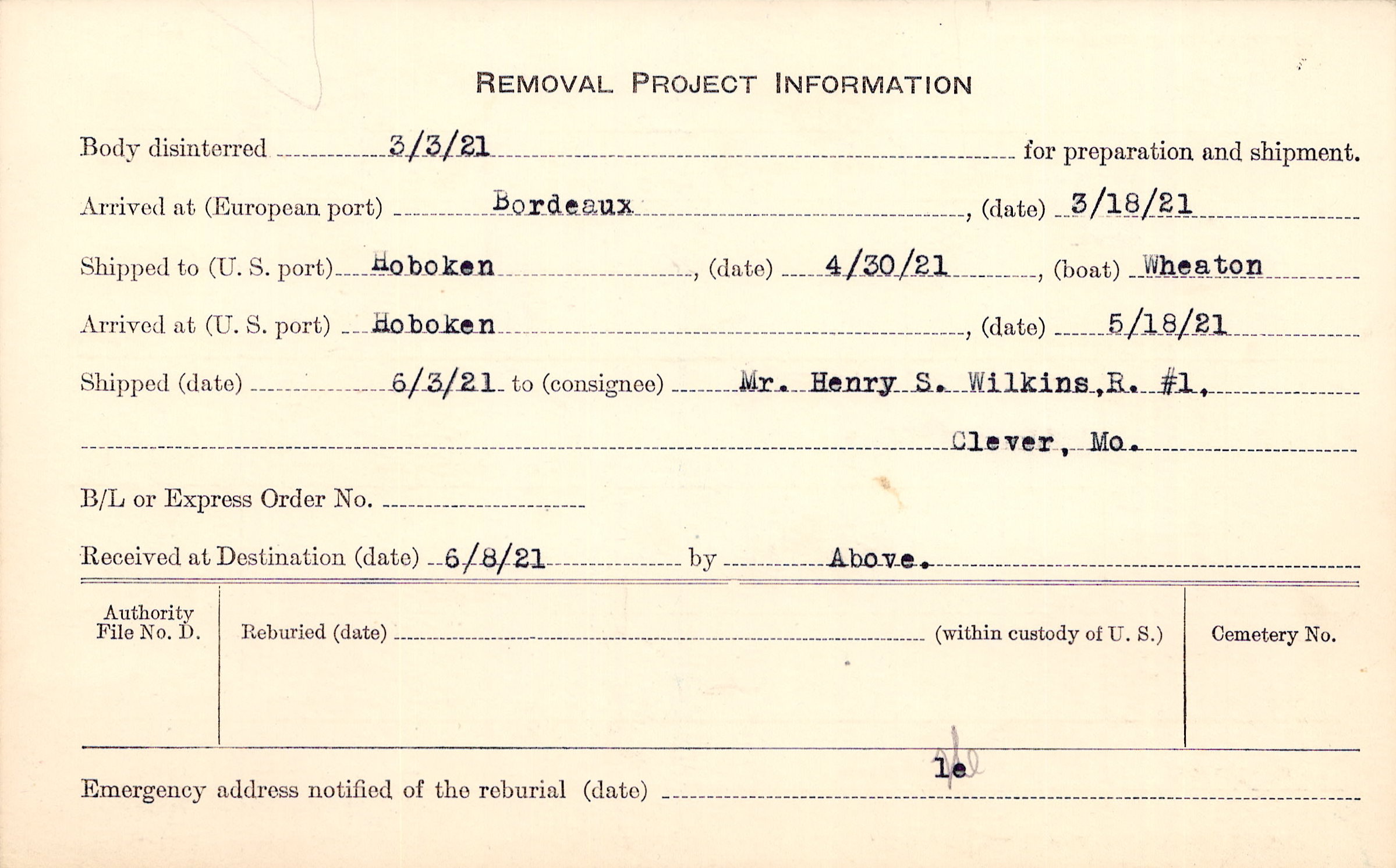 Body disinterred 3/3/1921 for preparation and shipment.