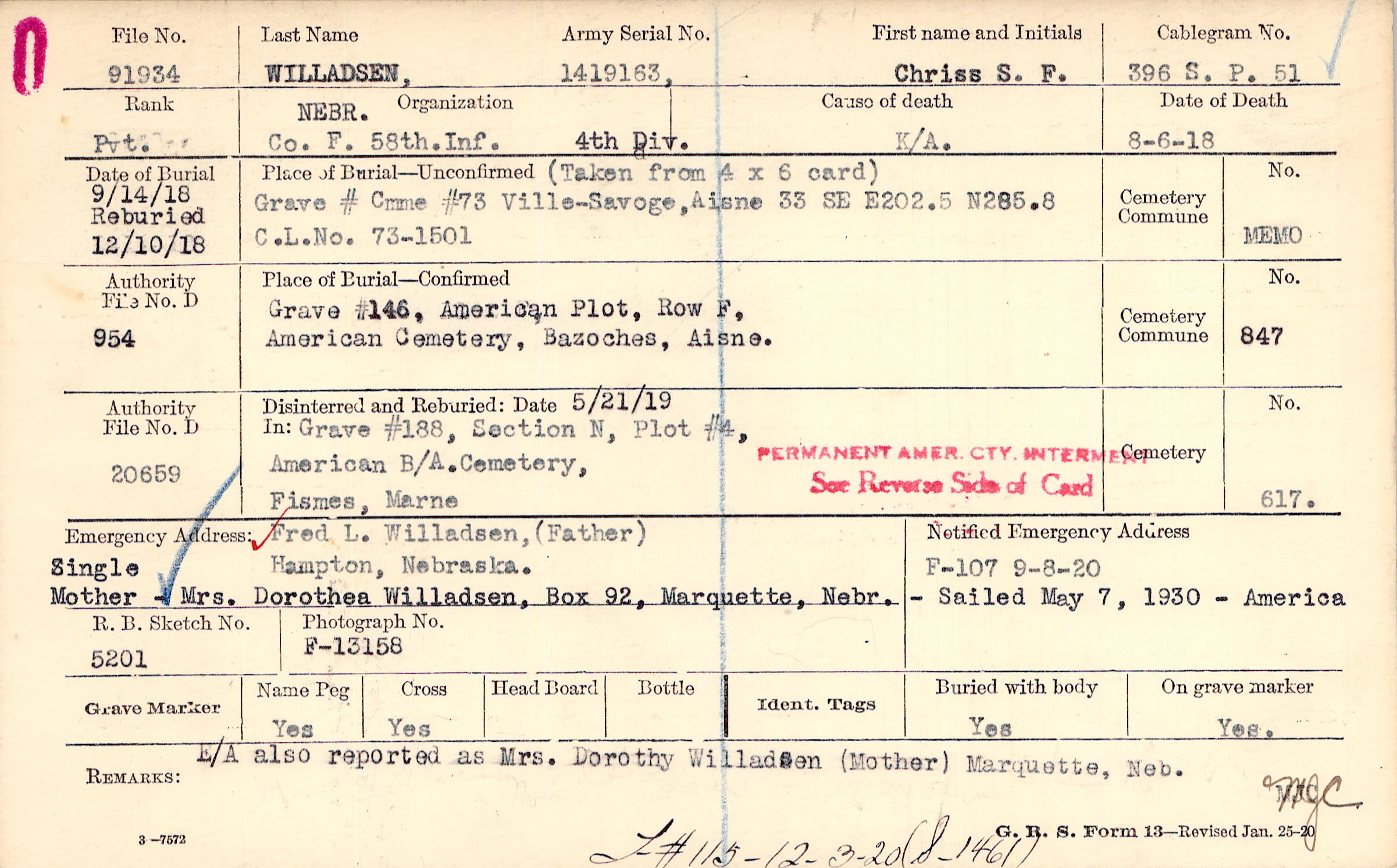 Fred L. Willadsen, (Father), Hampton, Nebraska., Single Mother - Mrs. Dorothea Willadsen, Box 92, Marquette, Nebr. - Sailed May 7, 1930 - America