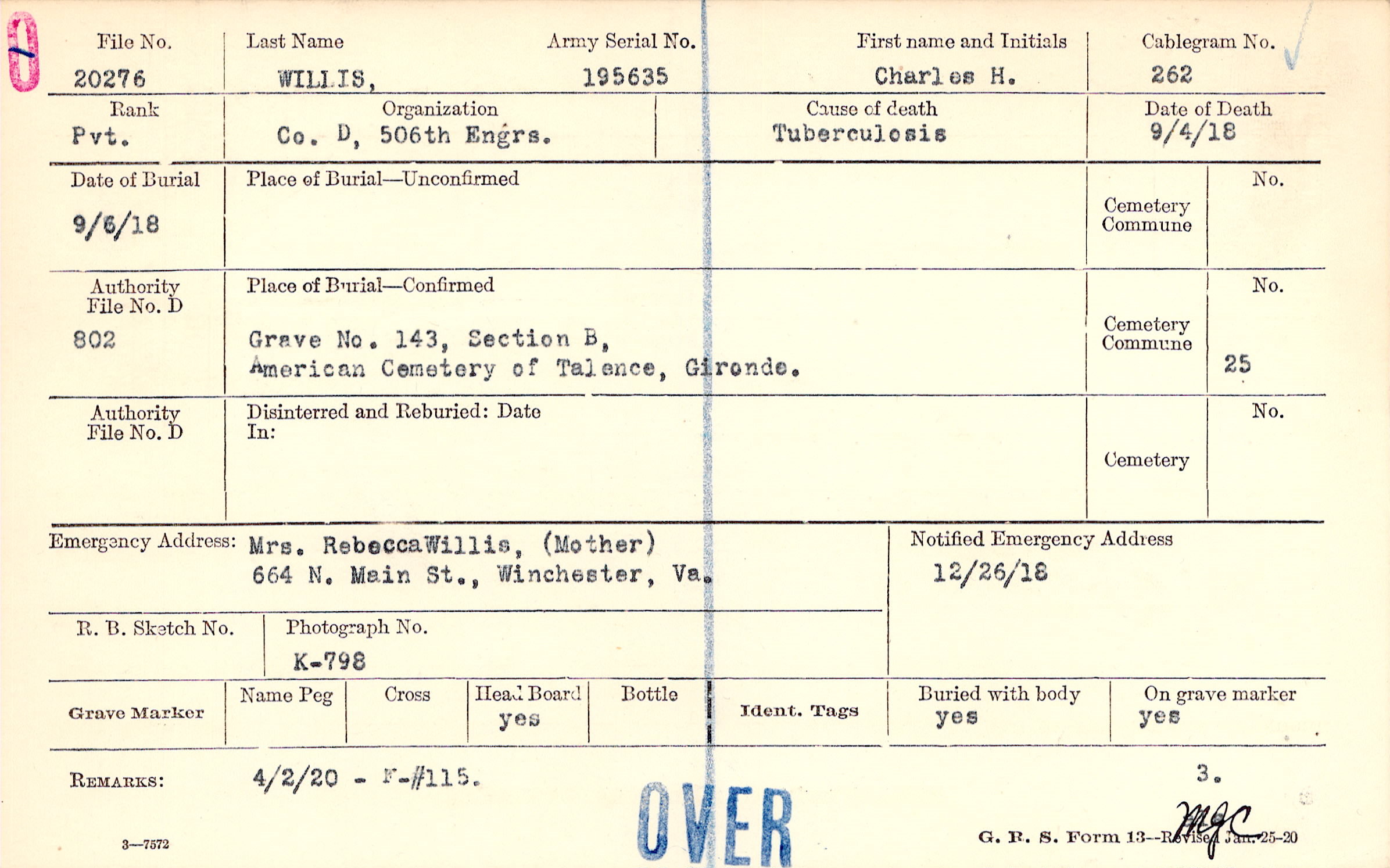 Mrs. Rebecca Willis, (Mother), 664 N. Main St. , Winchester, Va.