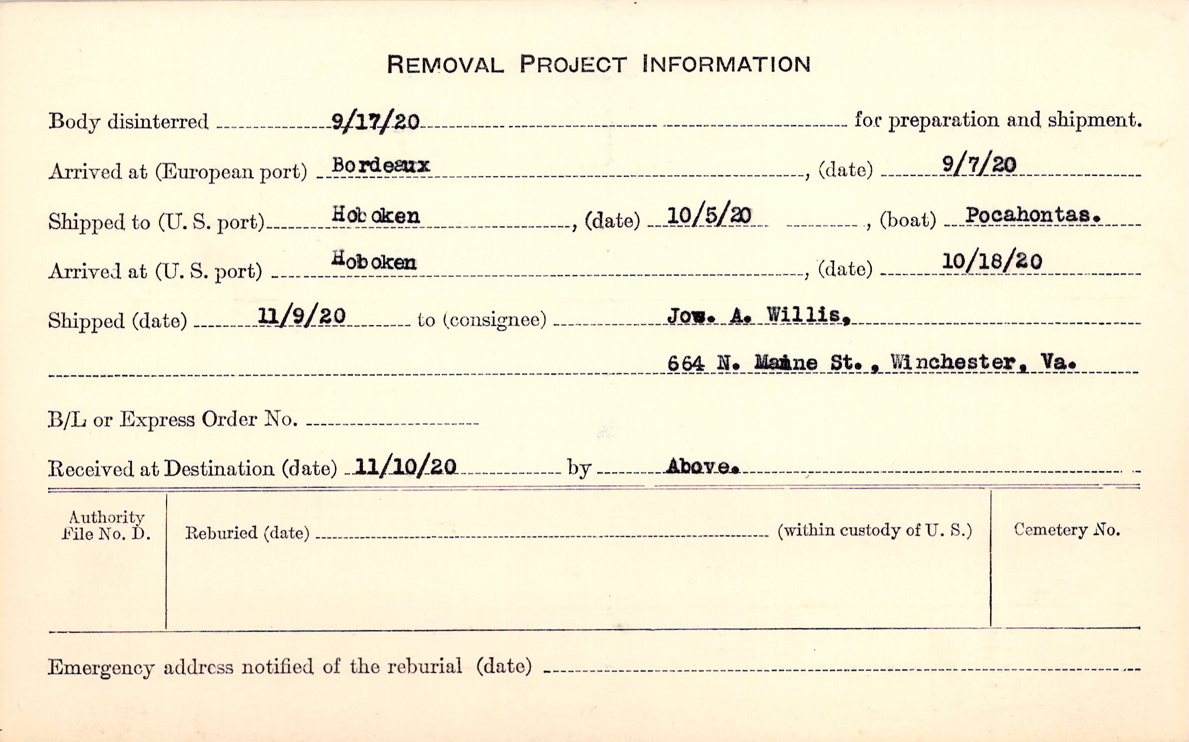 Body disinterred 9/17/1920 for preparation and shipment.