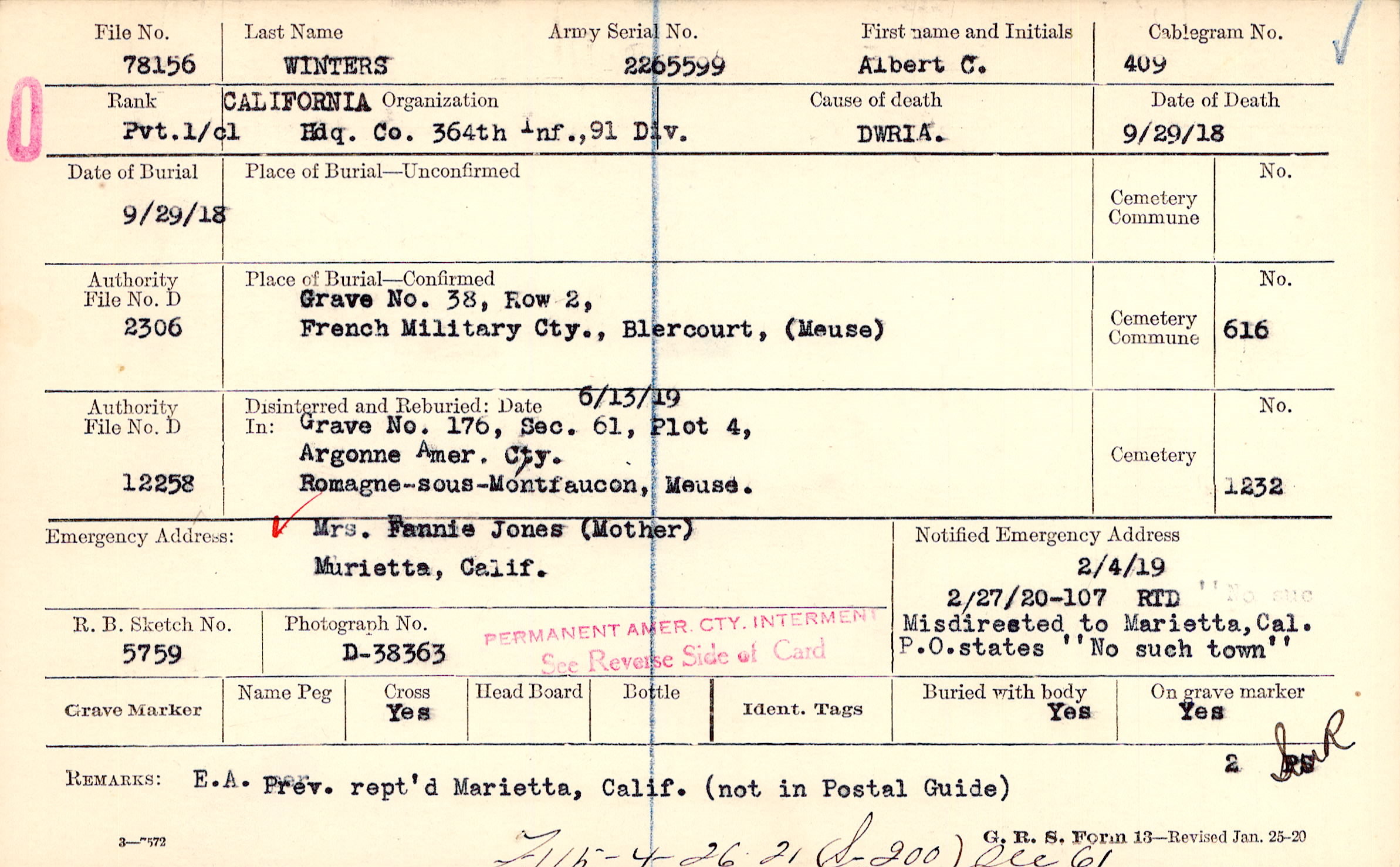 2/4/1919, Form 107: 2/27/1920 RTD, Misdirected to Marietta, Cal, P O states "No such town"