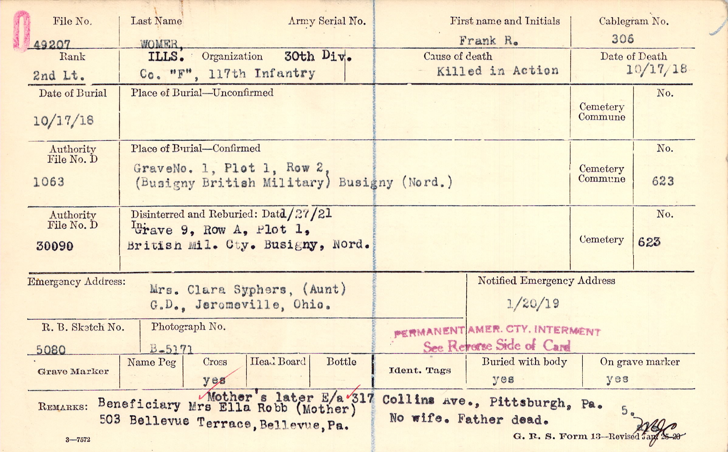 Mother's later E/a 317 Collins Ave., Pittsburgh, Pa. Beneficiary Ms Ella Robb (Mother), 503 Bellevue Terrace, Bellevue, Pa.