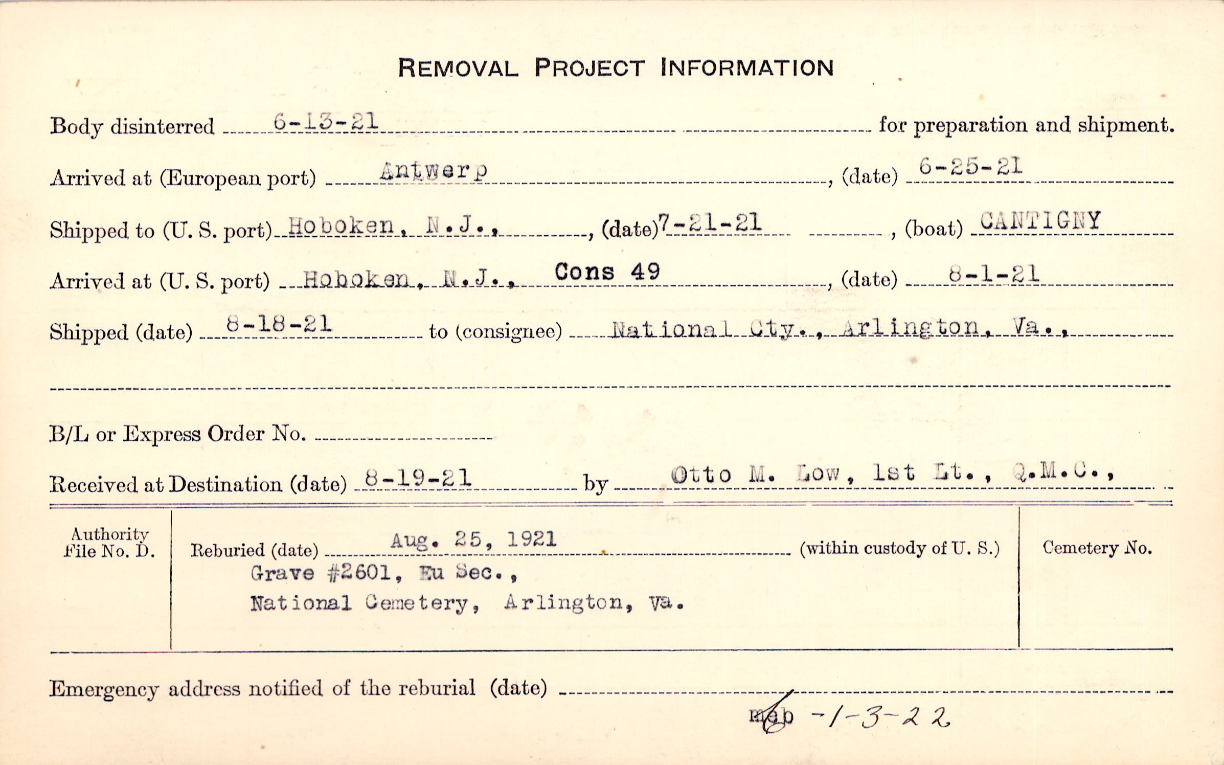 Body disinterred 6/13/1921 for preparation and shipment.