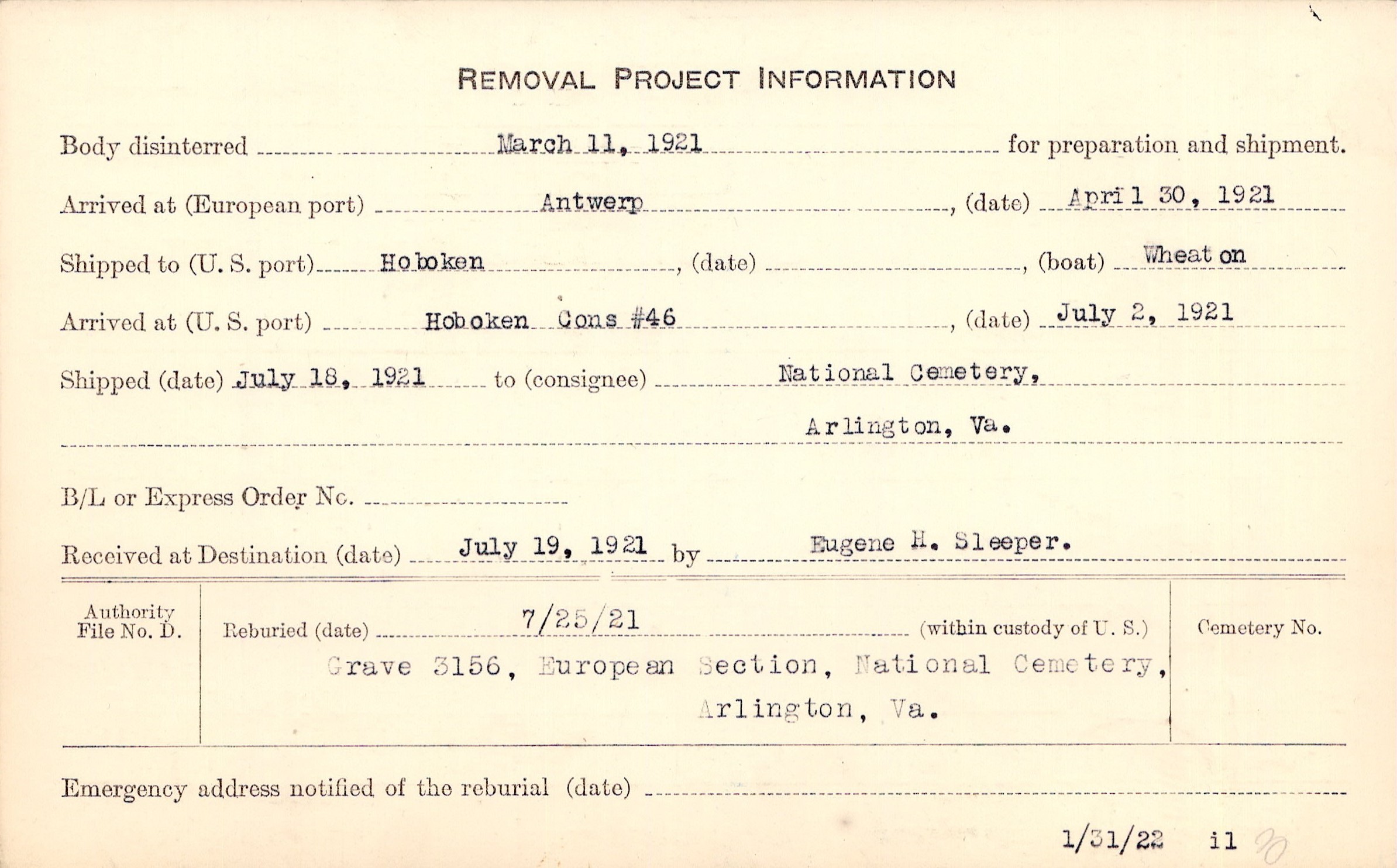 Body disinterred 3/11/1921 for preparation and shipment.