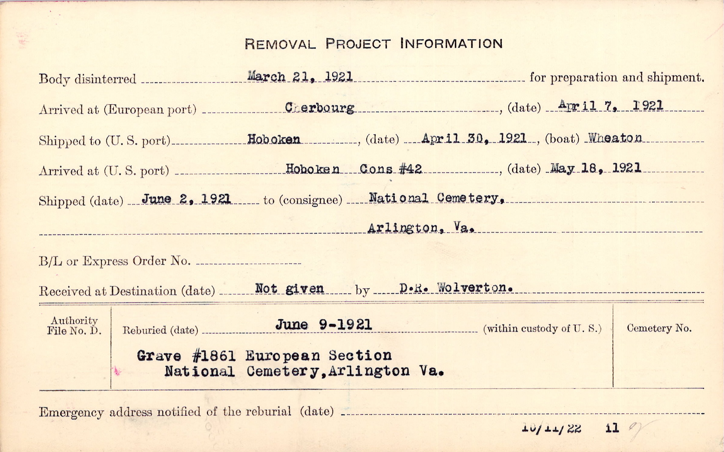 Body disinterred 3/21/1921 for preparation and shipment.