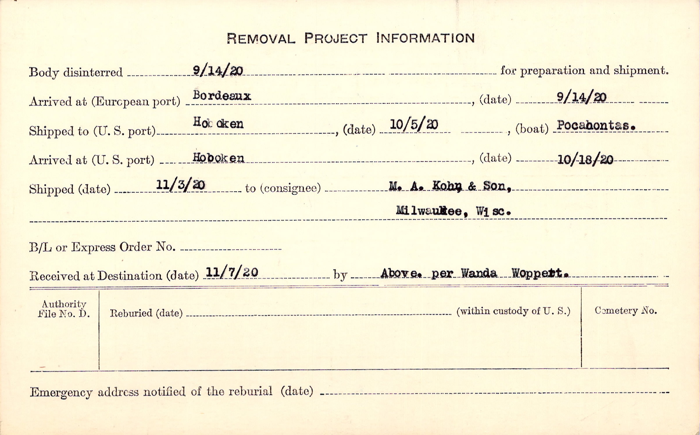 Body disinterred 9/14/1920 for preparation and shipment.
