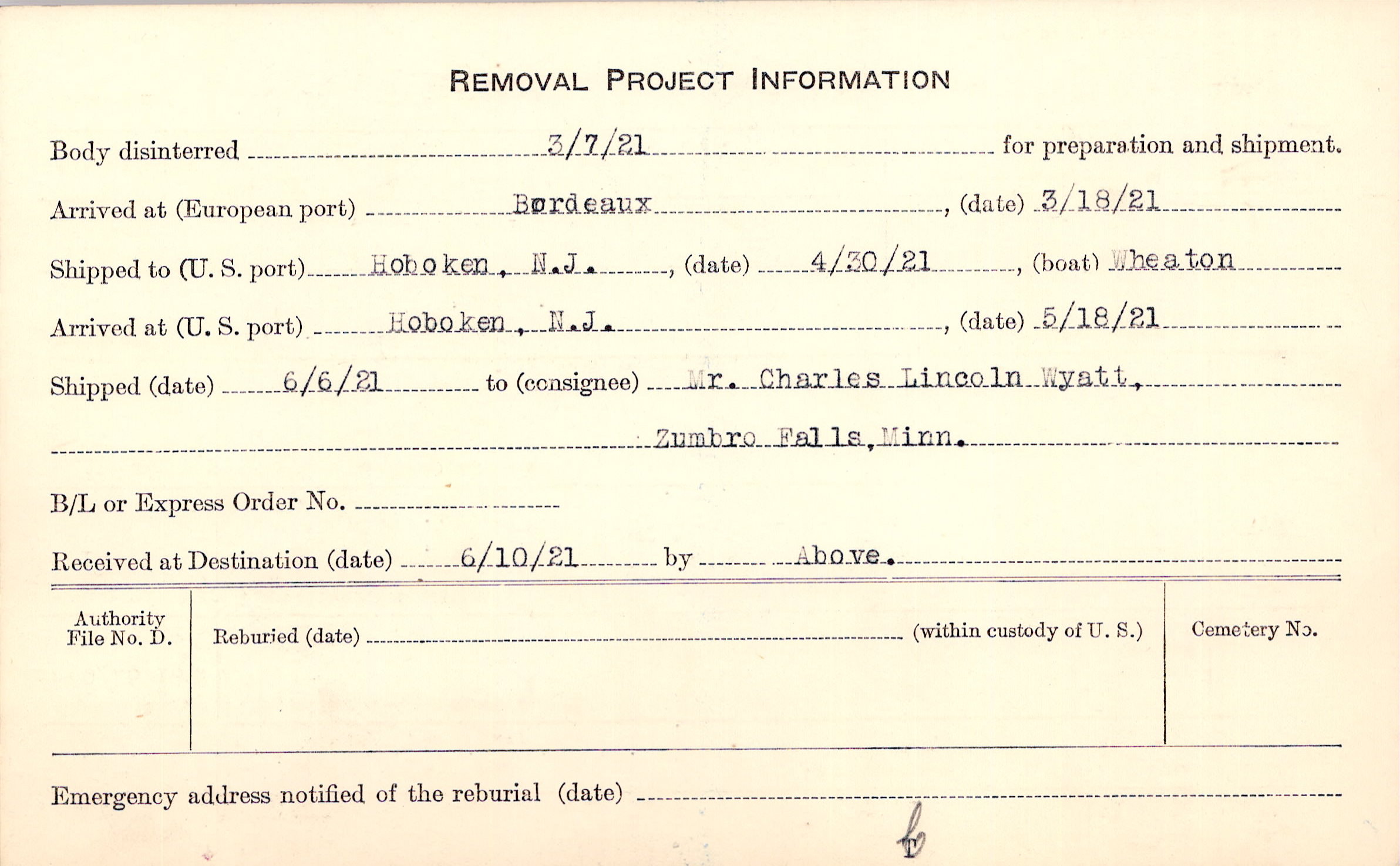 to Mr. Charles Lincoln Wyatt, Zumbro Falls, Minn.