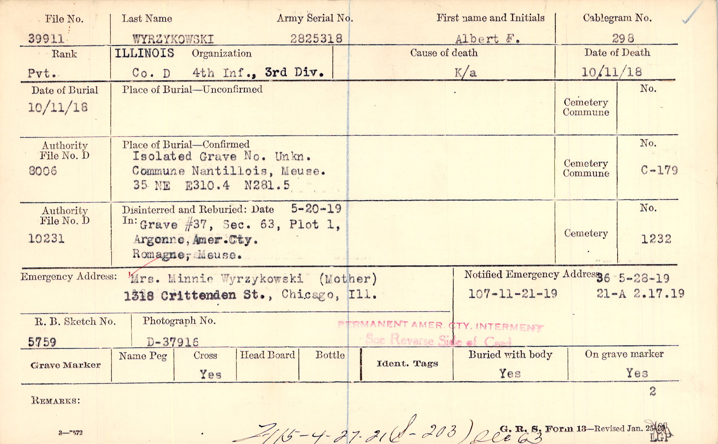 Mrs. Minnie Wyrzykowski (Mother), 1318 Crittenden St., Chicago, Ill.