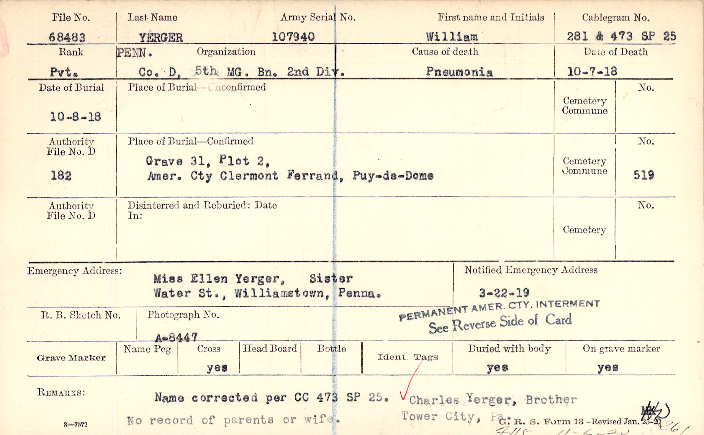 Name corrected per CC 474 SP 25. Charles Yerger, Brother, Tower City, Pa. No record of parents of wife. 261, F115 11-6-20 261