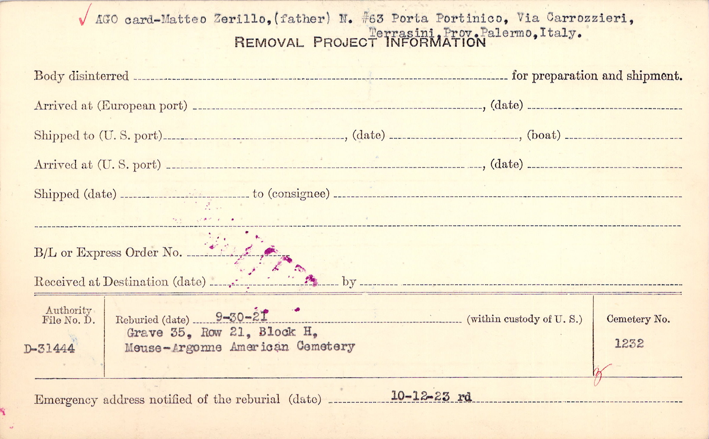 AGO card - Matteo Zerillo, (father) N. #63 Porta Portinico, Via Carrozzieri, Terrasini, Prov. Palermo, Italy. |