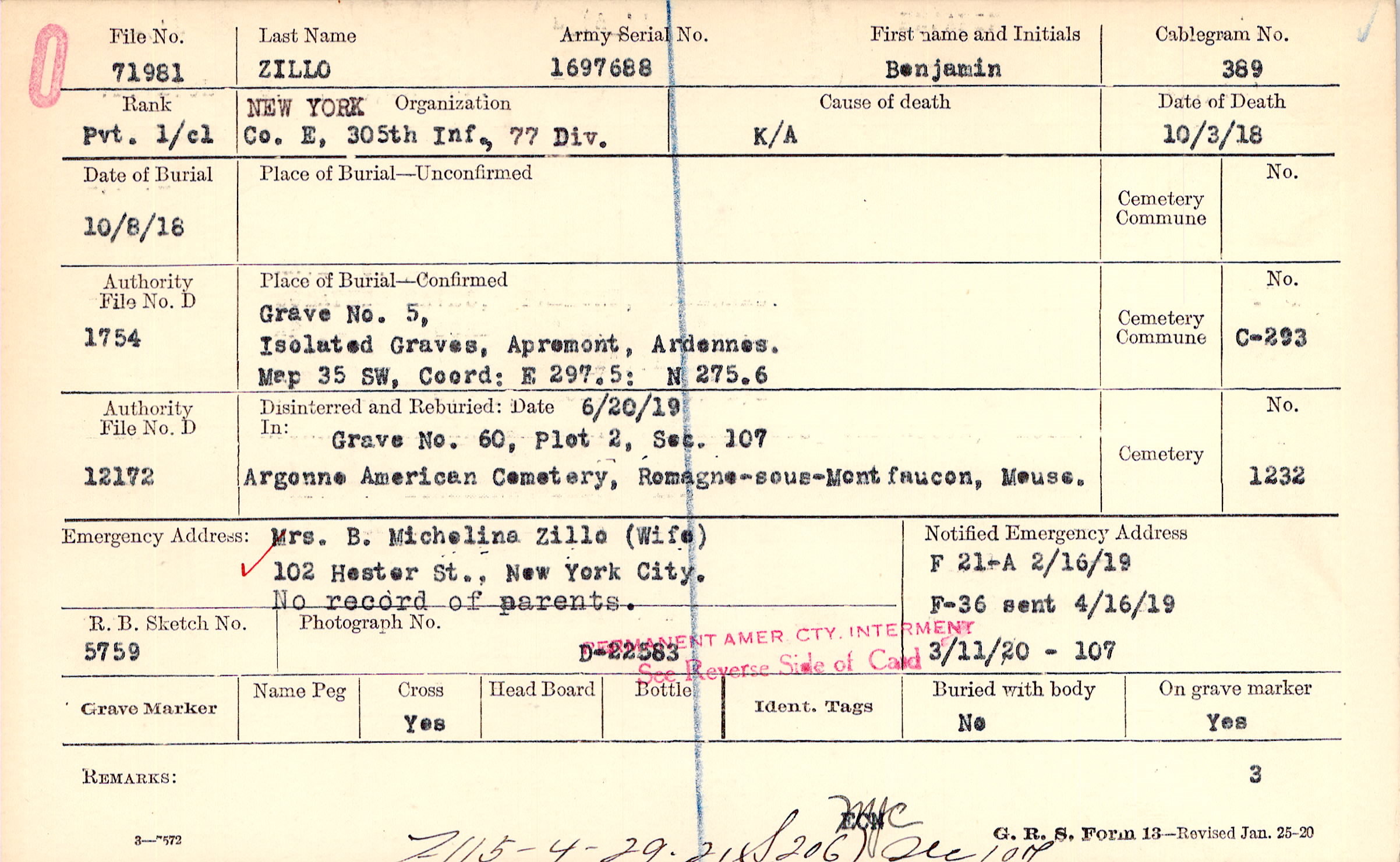Mrs. B. Michelina Zillo (Wife), 102 Hester St., New York City., No record of parents.