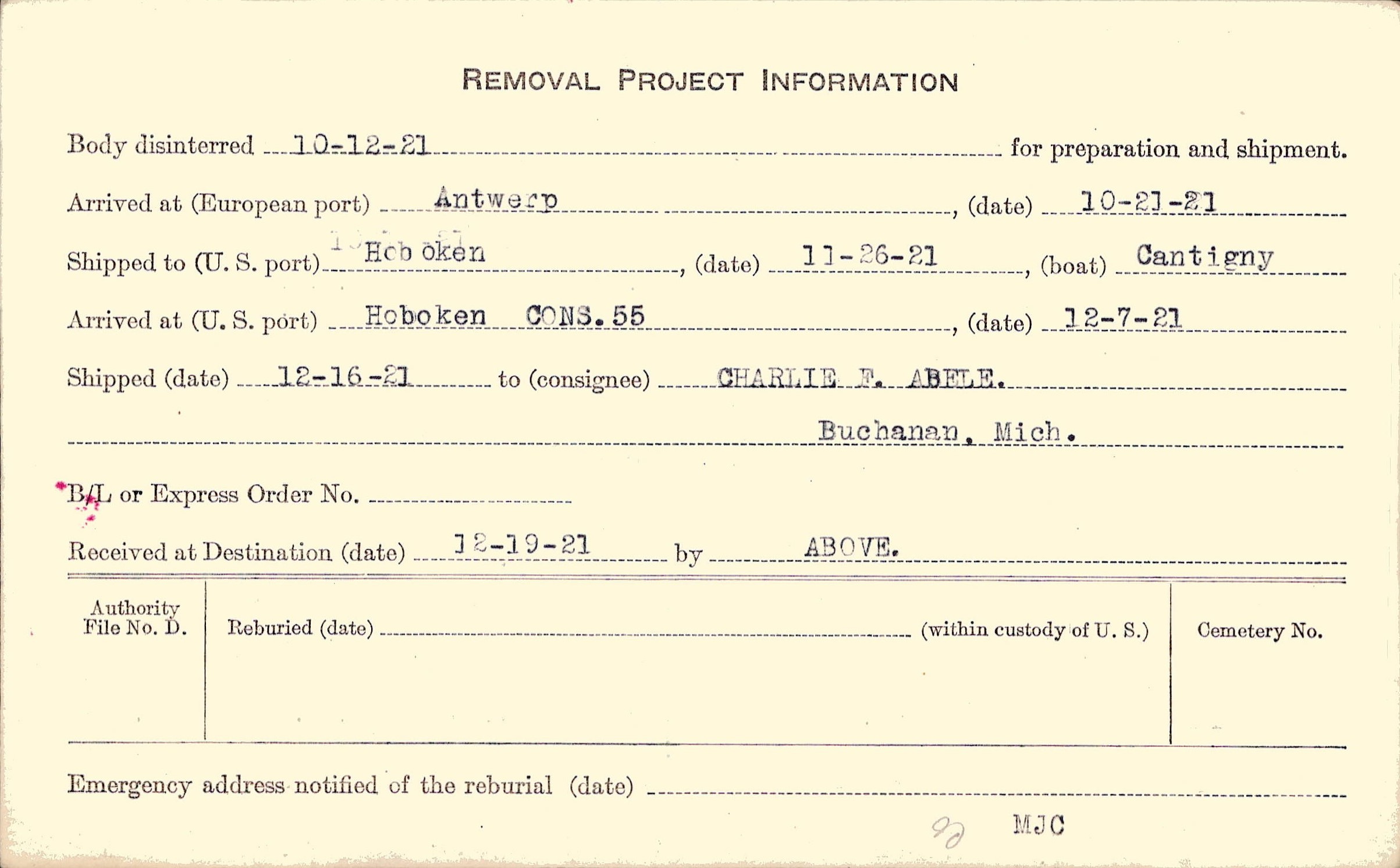 Body disinterred 10/12/1921 for preparation and shipment.