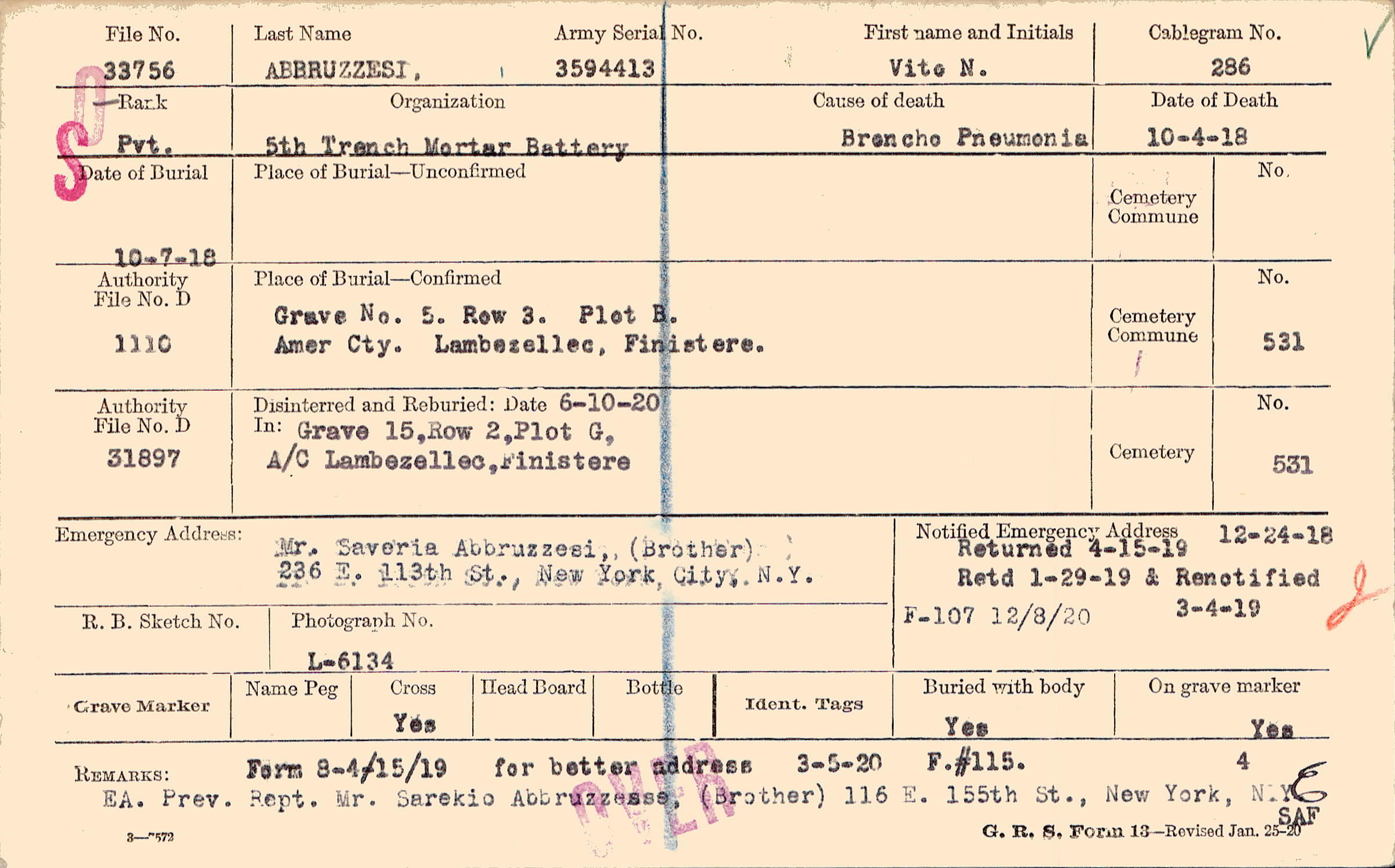 Mr. Saveria Abbruzzesi, (Brother), 236 E. 113th St., New York City, N.Y.