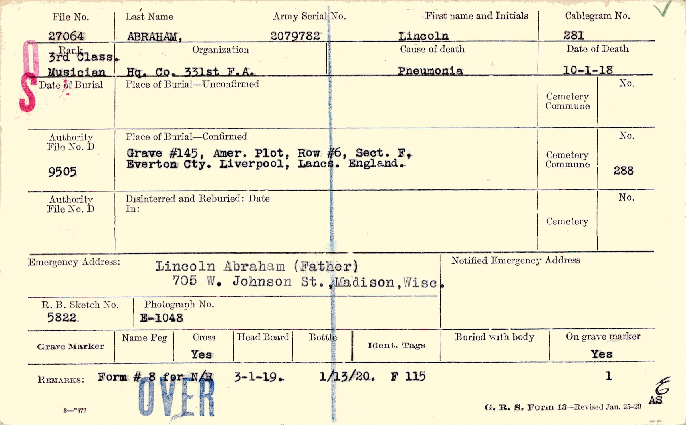 Lincoln Abraham (Father), 705 W. Johnson St., Madison, Wisc.