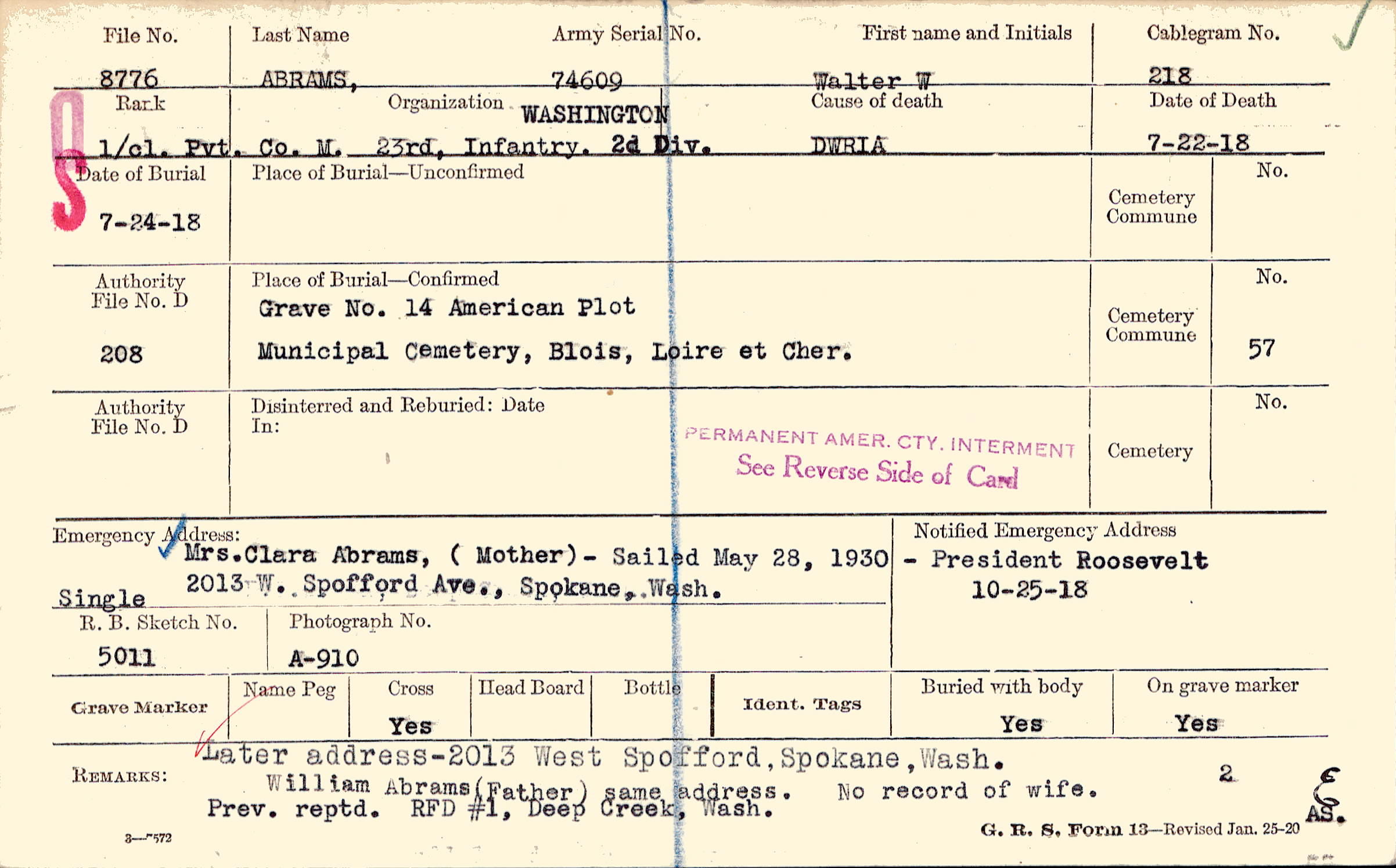 Later address - 2013 West Spofford, Spokane, Wash. William Abrams (Father) same address. No record of wife.