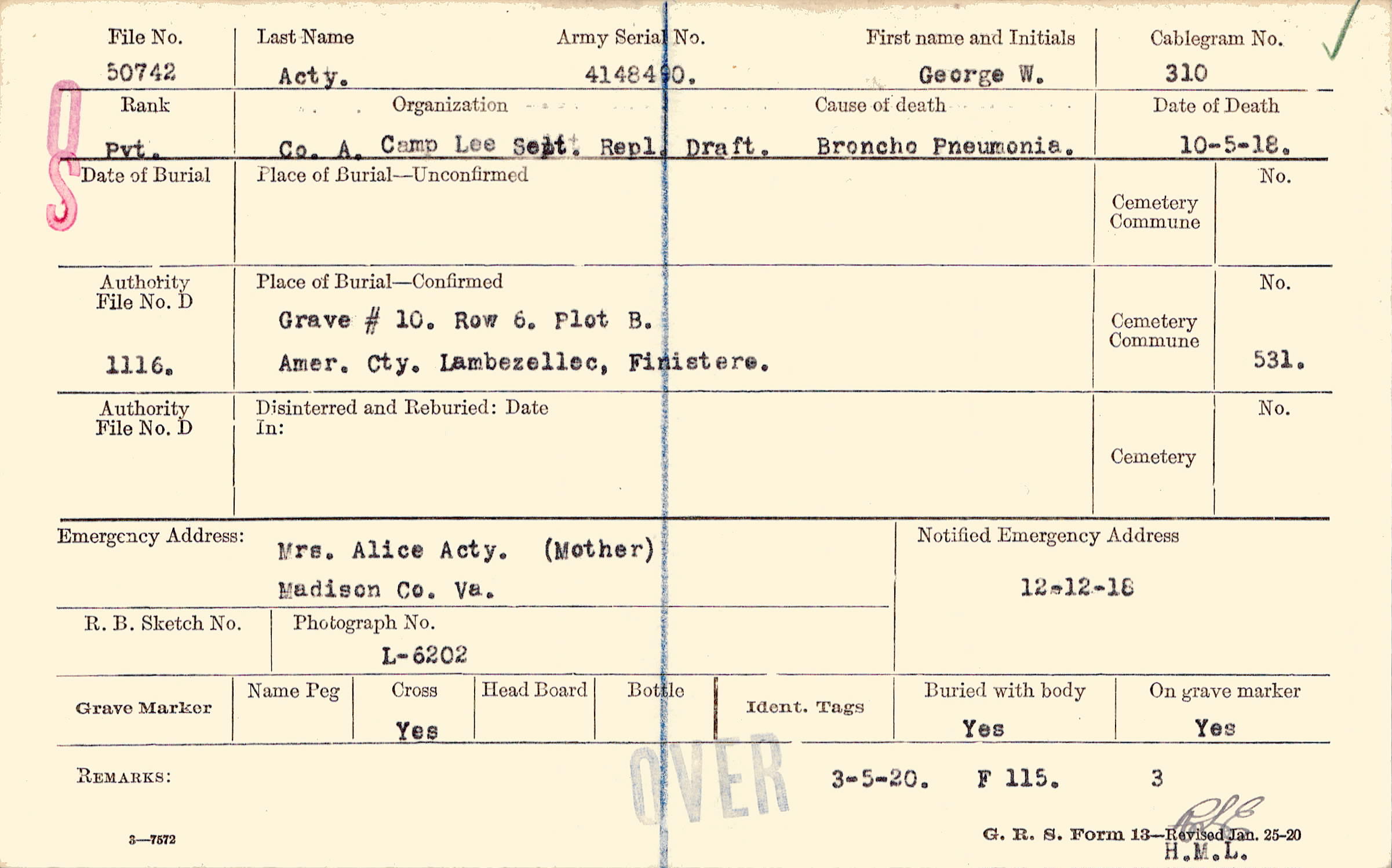 Grave #10, Row 6, Plot B, Amer. Cty., Lambezellec, Finistere