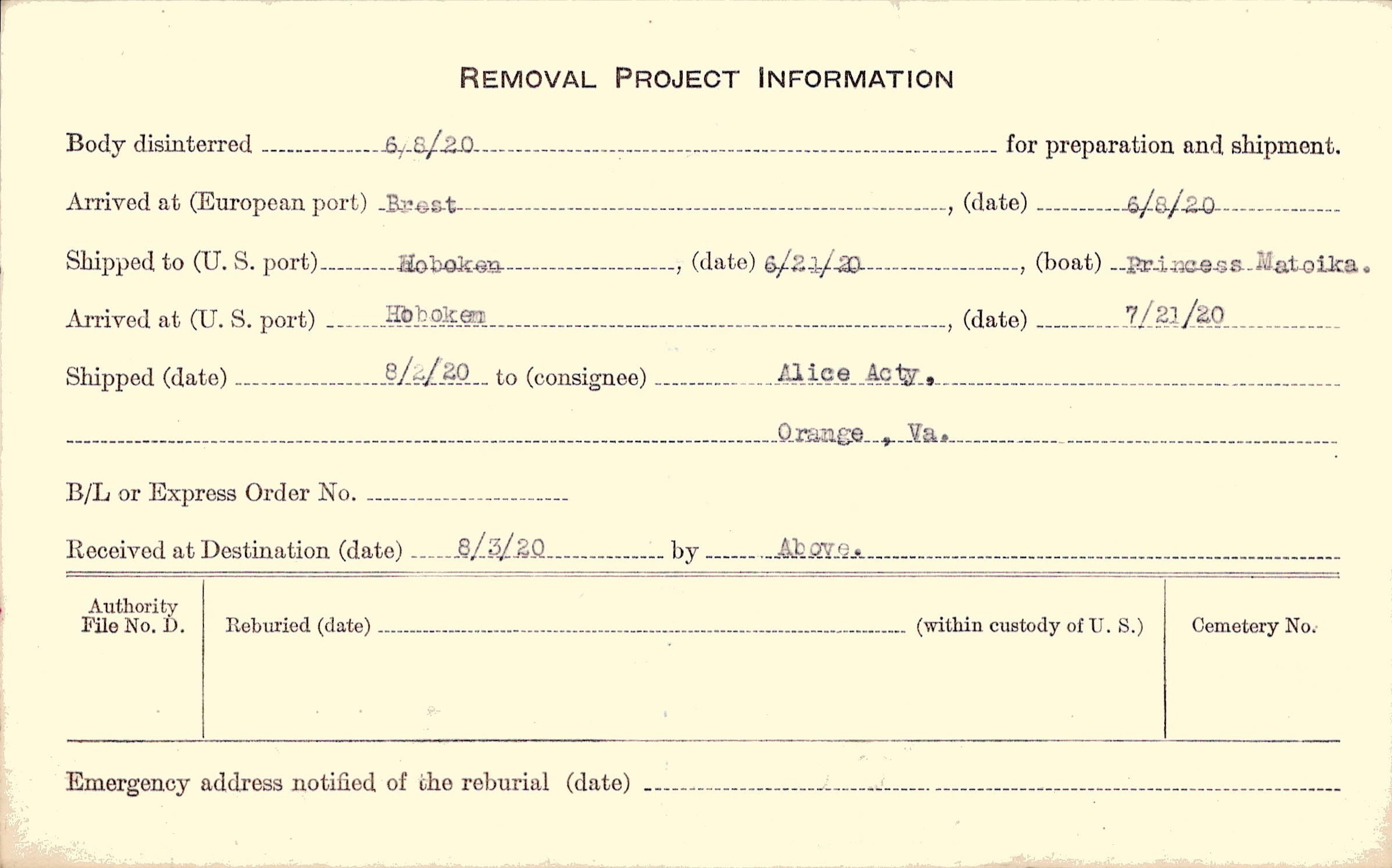 Body disinterred 6/8/1920 for preparation and shipment.