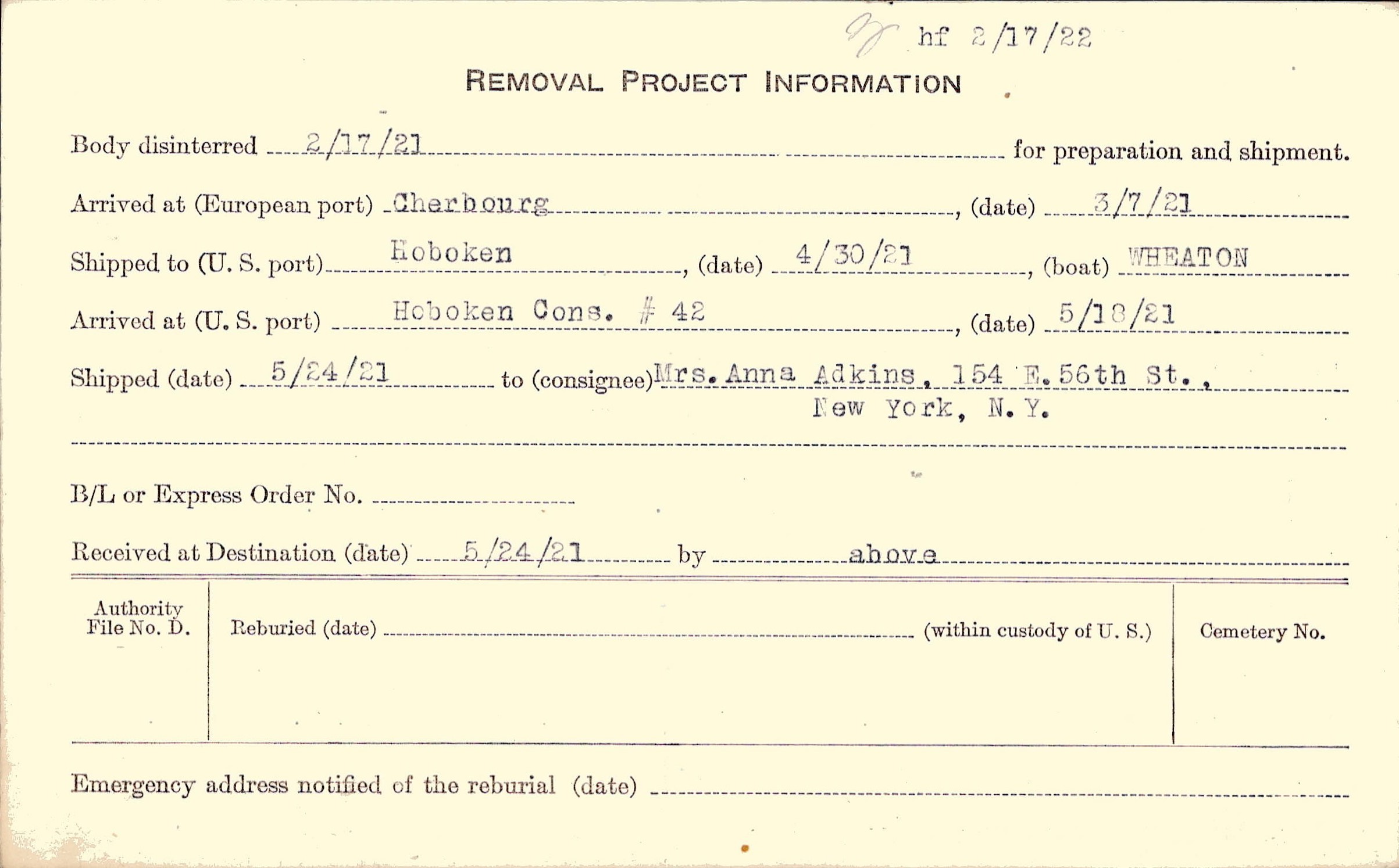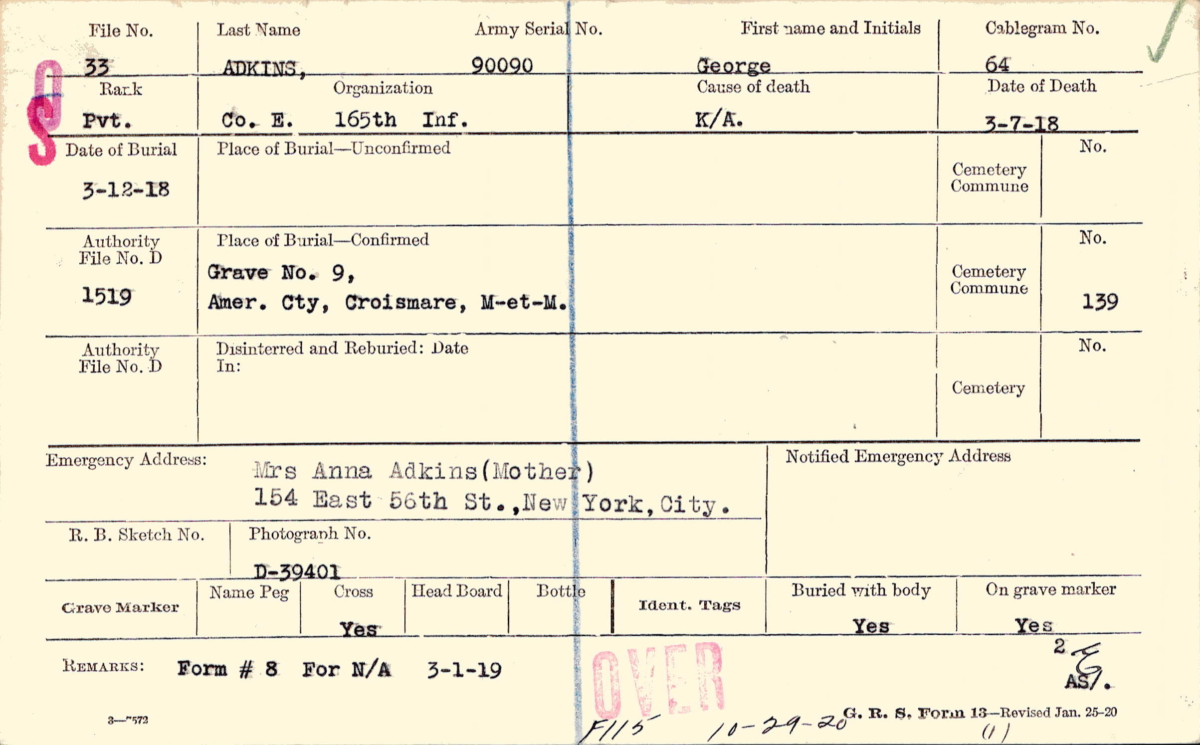 Mrs Anna Adkins (Mother), 154 East 56th St.,New York, City.