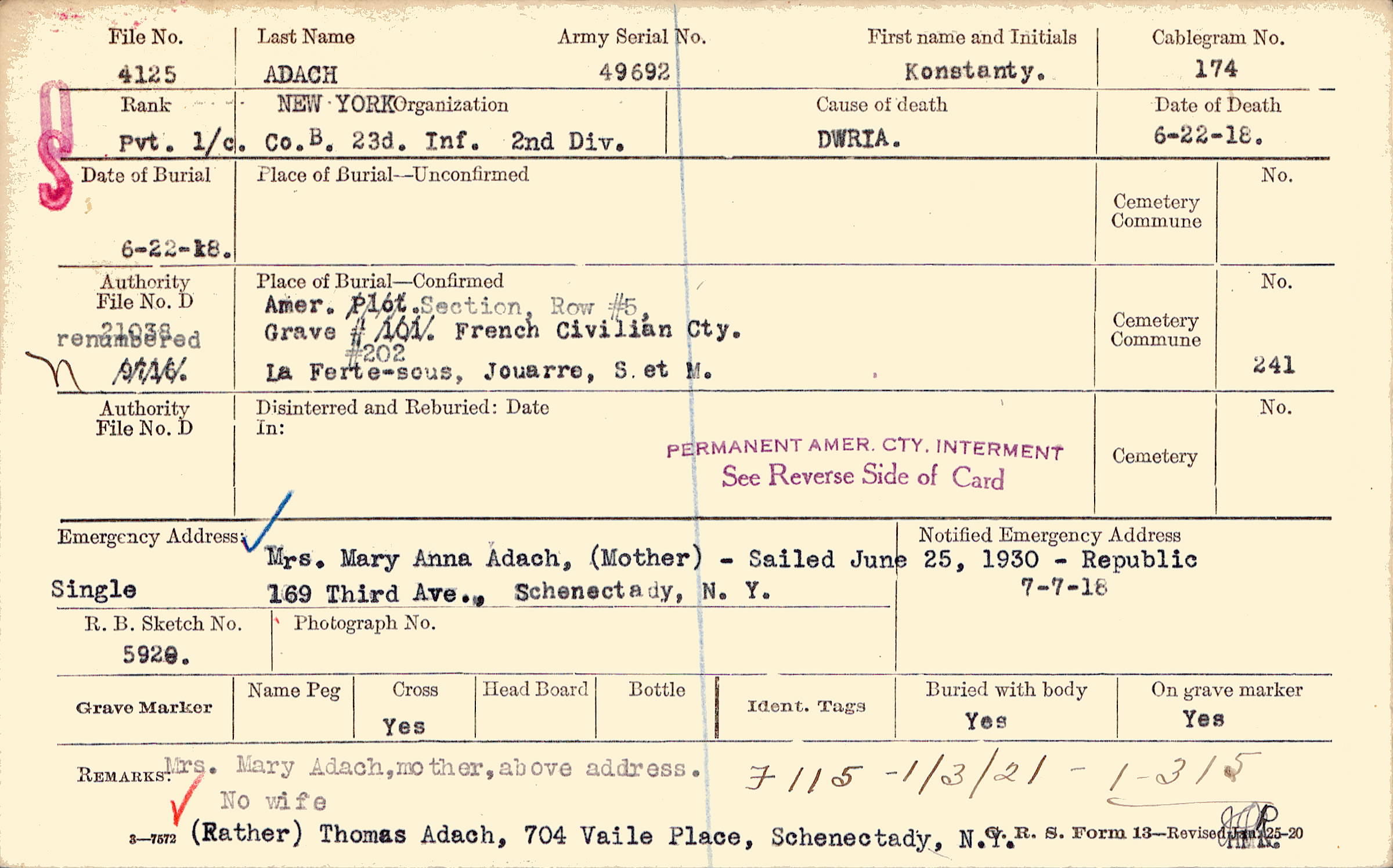 Mrs. Mary Anna Adach, (Mother), 169 Third Ave., Schenectady, N.Y., Single Sailed June 25, 1930 - Republic