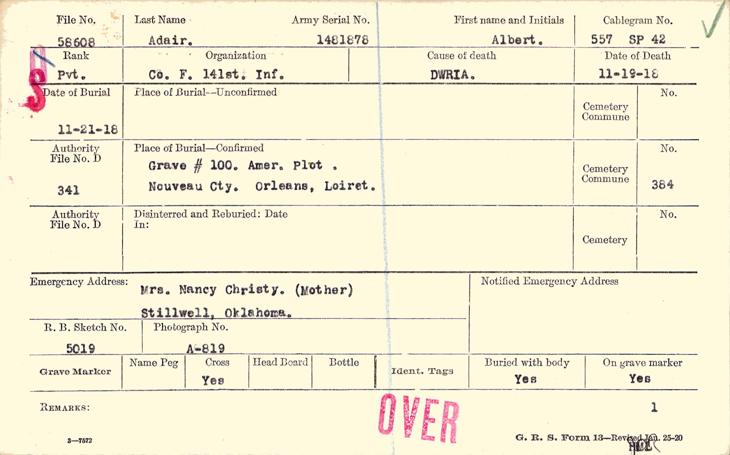 Grave # 100, Amer. Plot, Nouveau Cty., Orleans, Loiret.