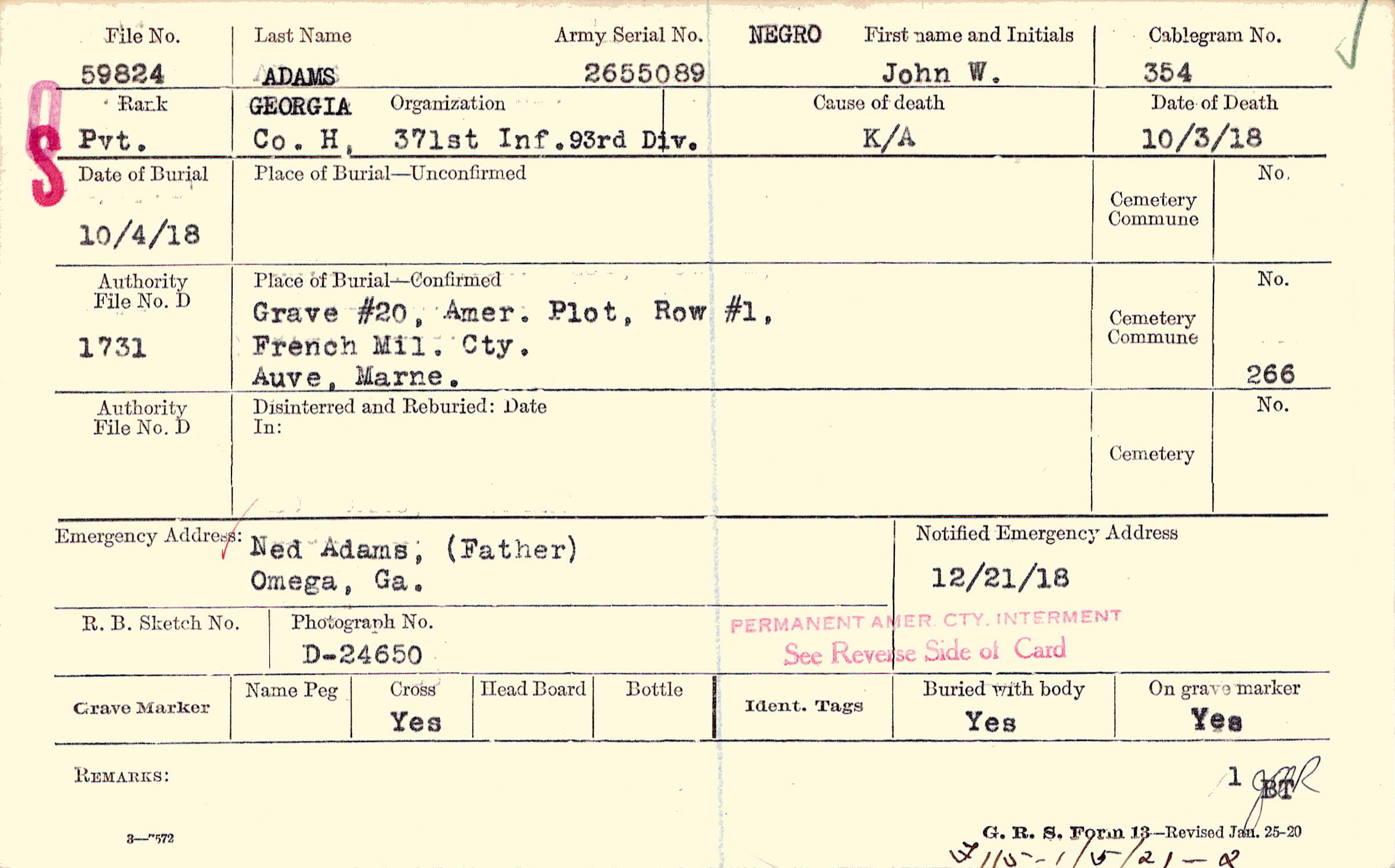 Grave #20, Amer. Plot, Row #1, French Mil. Cty., Auve, Marne.