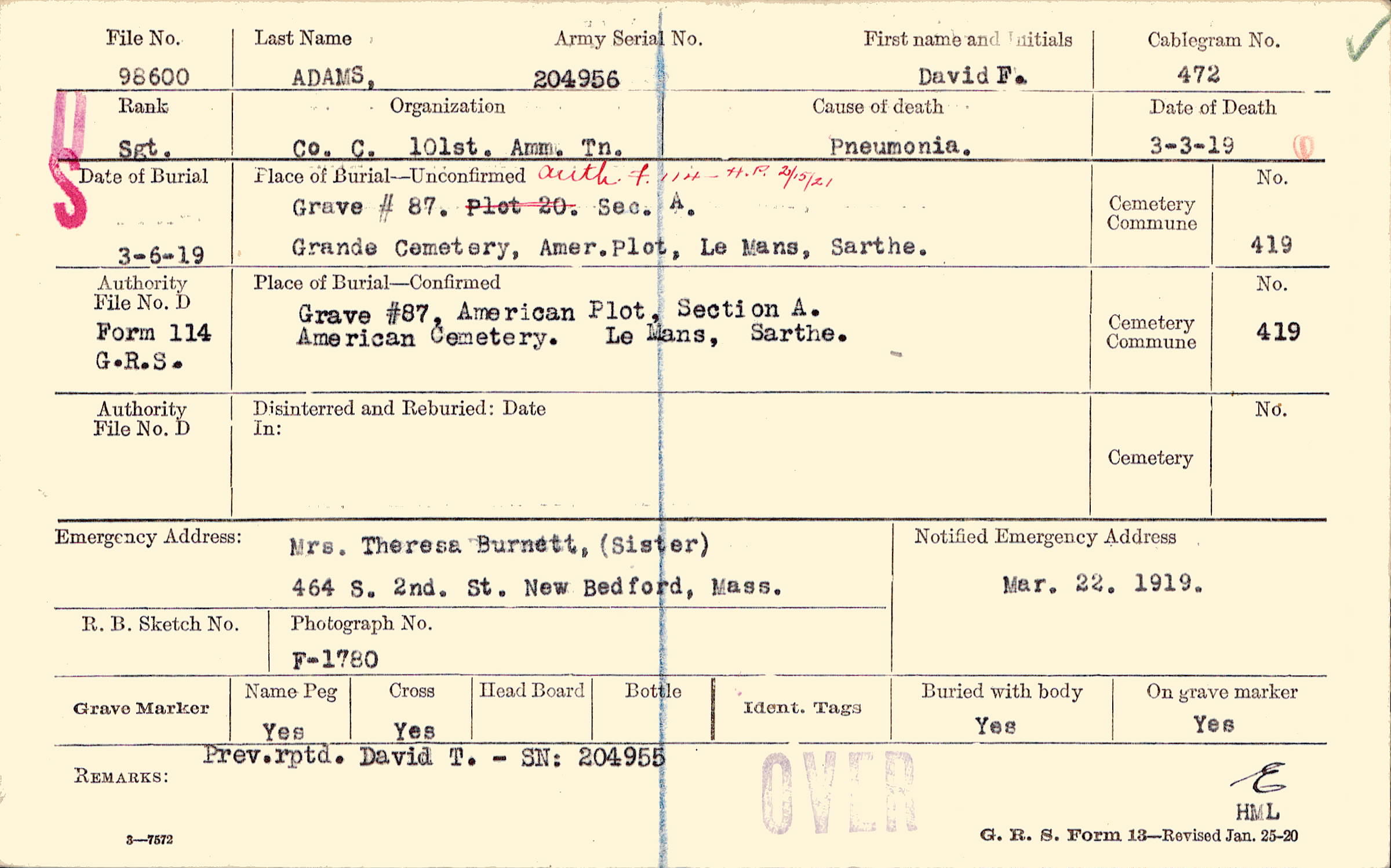 Grave # 87., Sec. A., Grande Cemetery, Amer.Plot, Le Mans, Sarthe.