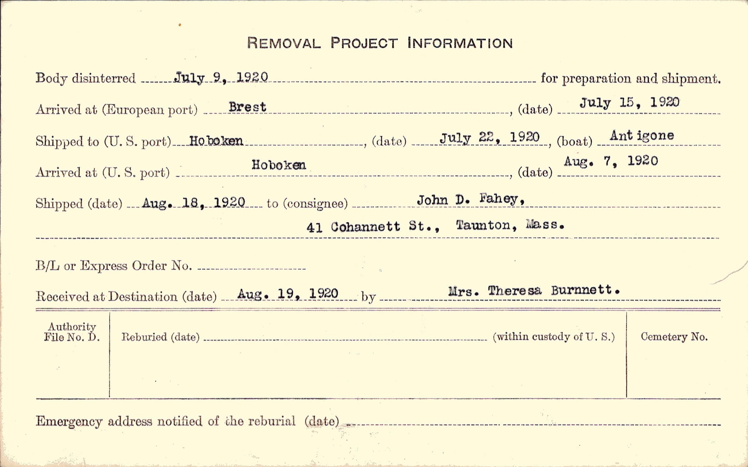 to John D. Fahey, 41 Cohannett St., Taunton, Mass.