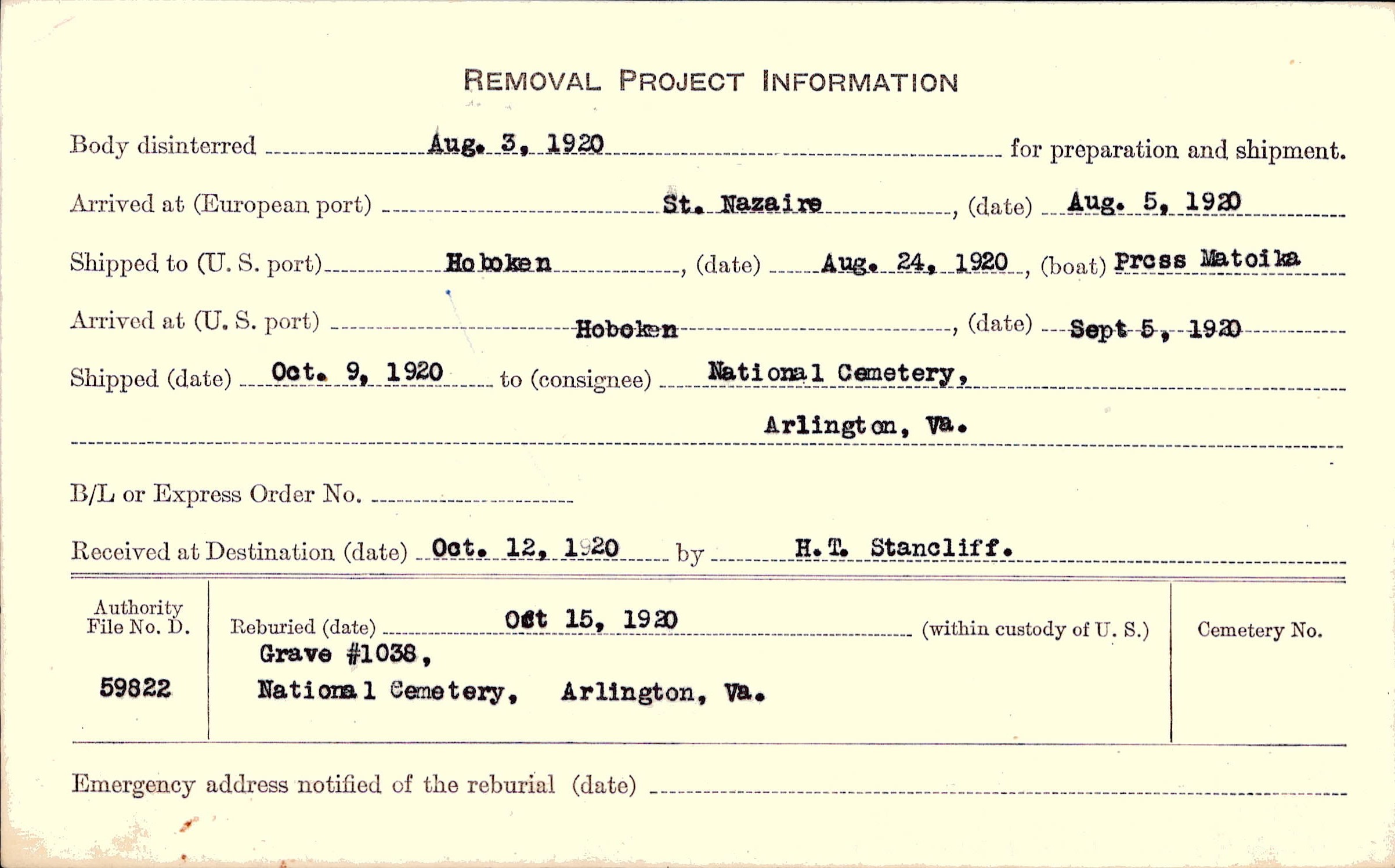 Body disinterred 8/3/1920 for preparation and shipment.