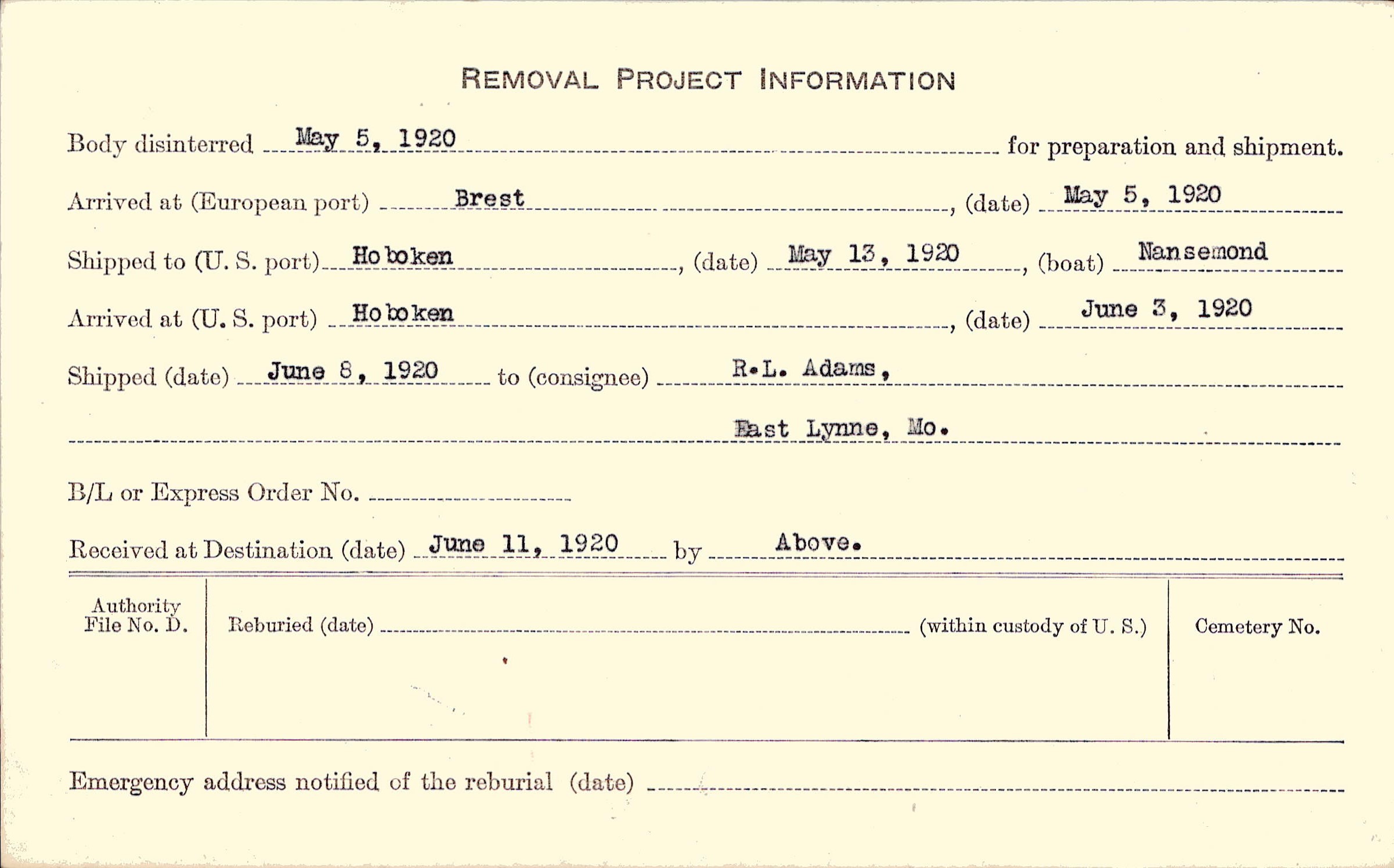Body disinterred 5/5/1920 for preparation and shipment.