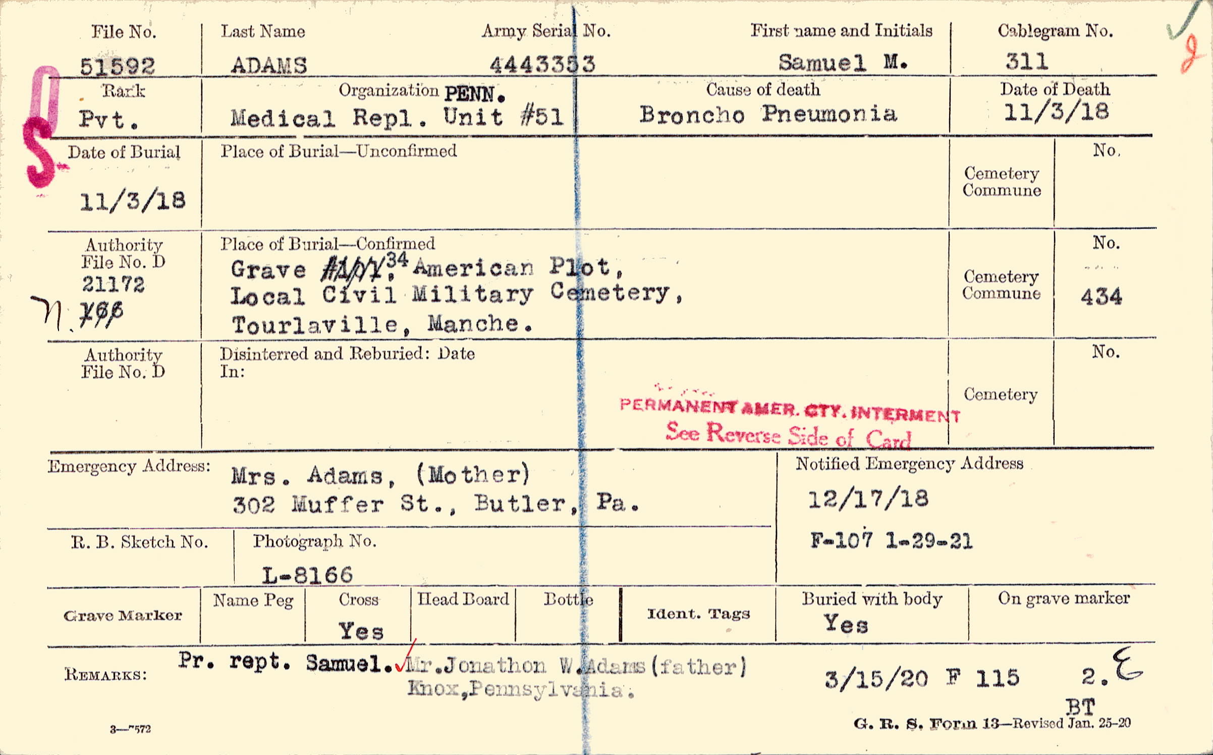 Mrs. Adams, (Mother), 302 Muffer St., Butler, Pa.