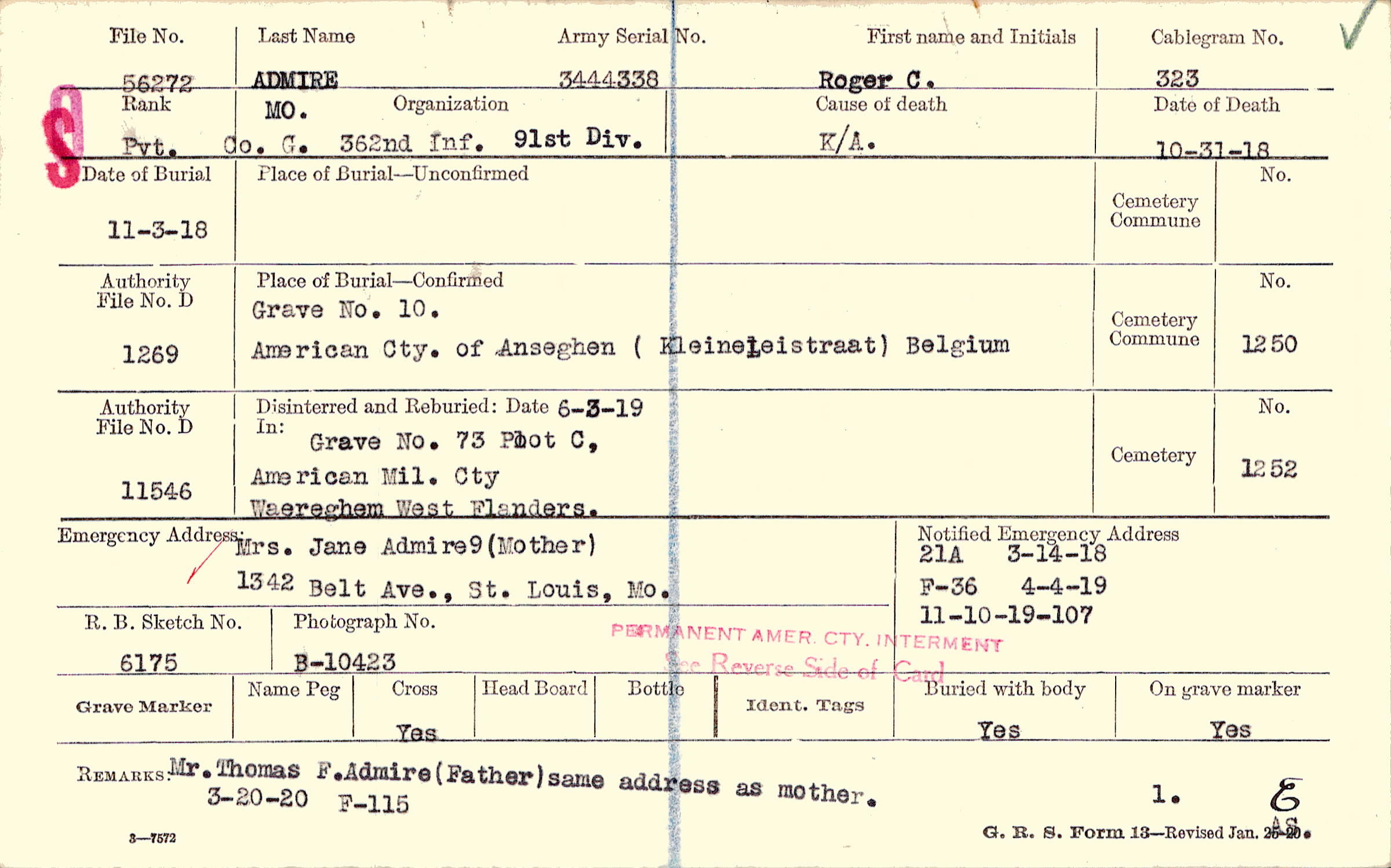 Grave 10,American Cty. of Anseghen (Kleineleistraat) Belgium