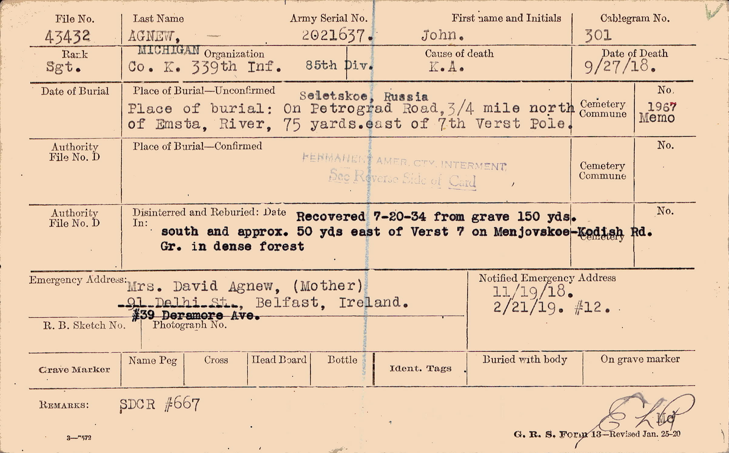 Seletskoe, Russia, Place of burial: On Petrograd Road, 3/4 mile north of Emsta, River, 75 yards east of 7th Verst Pole.