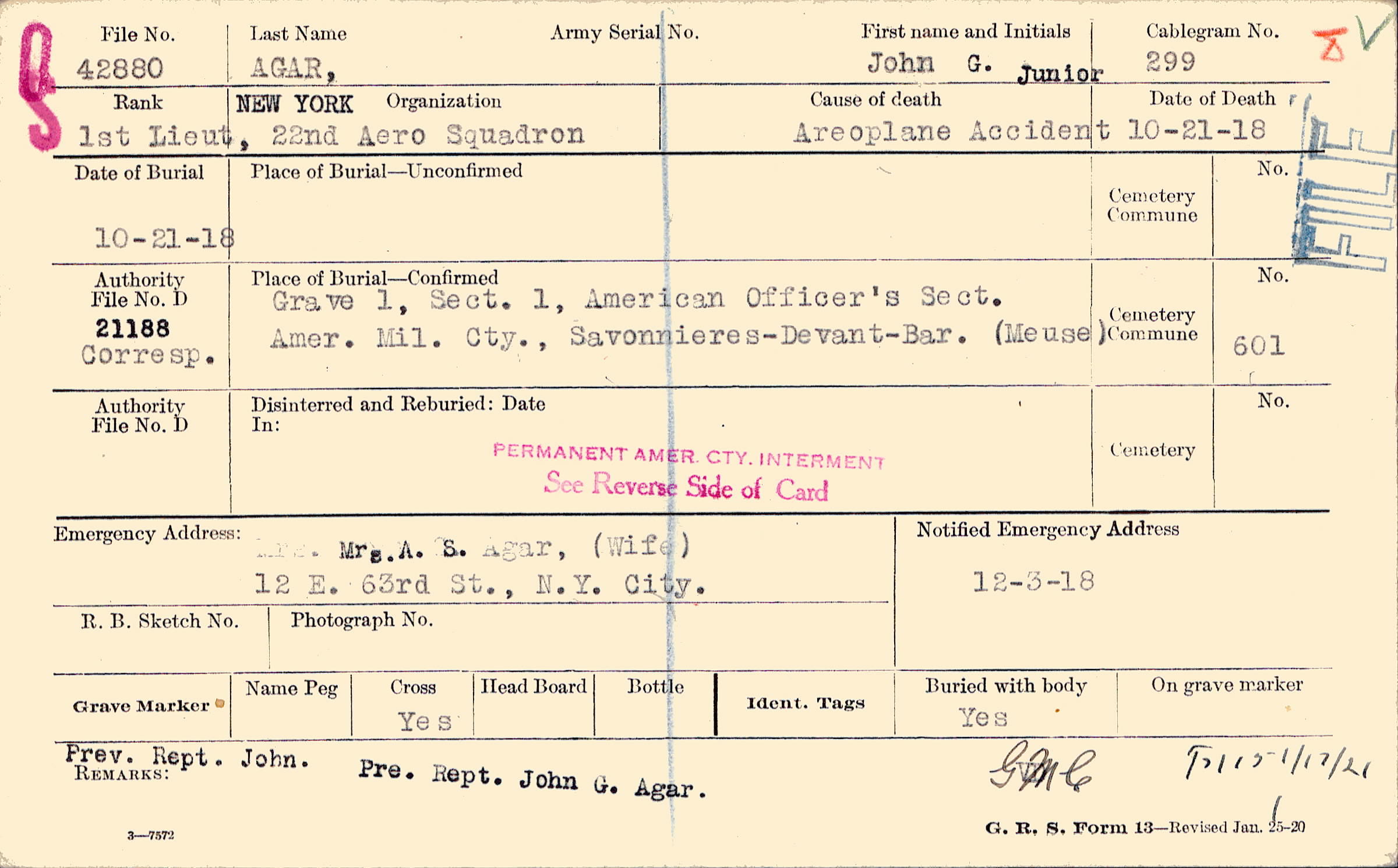 Mrs.A. S. Agar, (Wife), 12 E. 63rd St., N.Y. City.