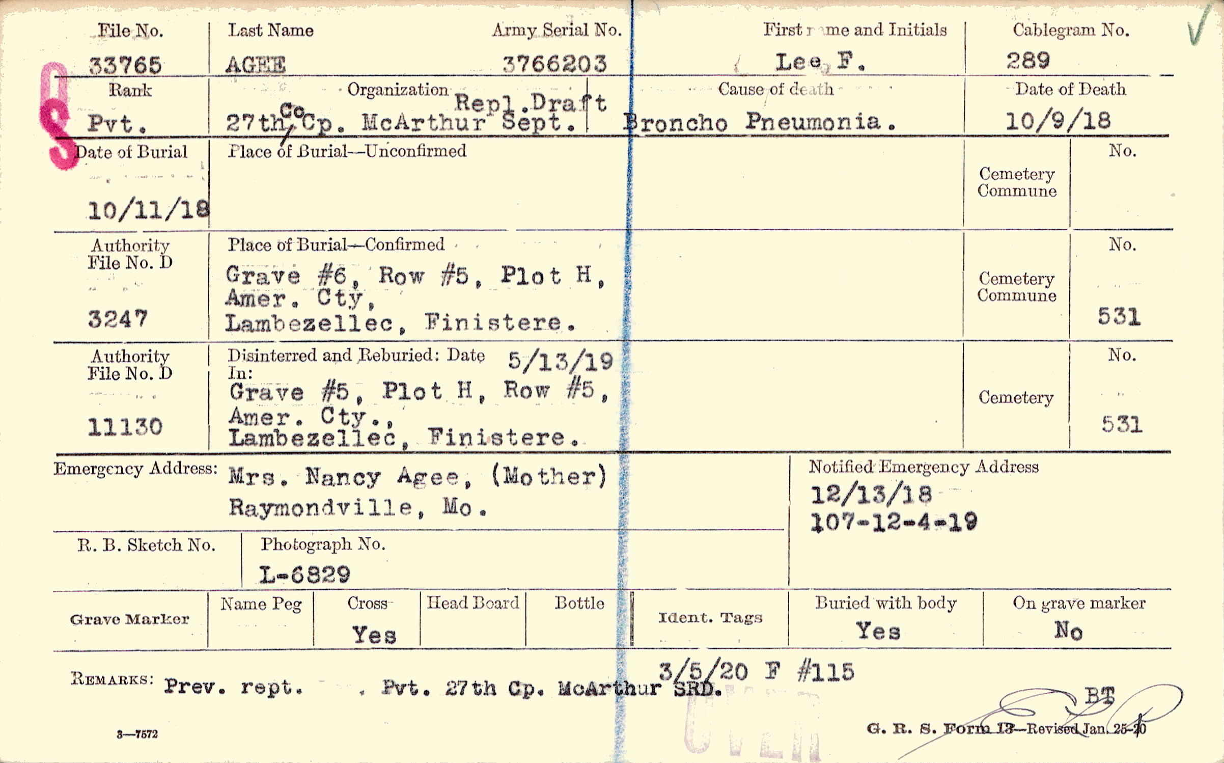 Grave #6, Row #5, Plot H, Amer. Cty., Lambezellec, Finistere.
