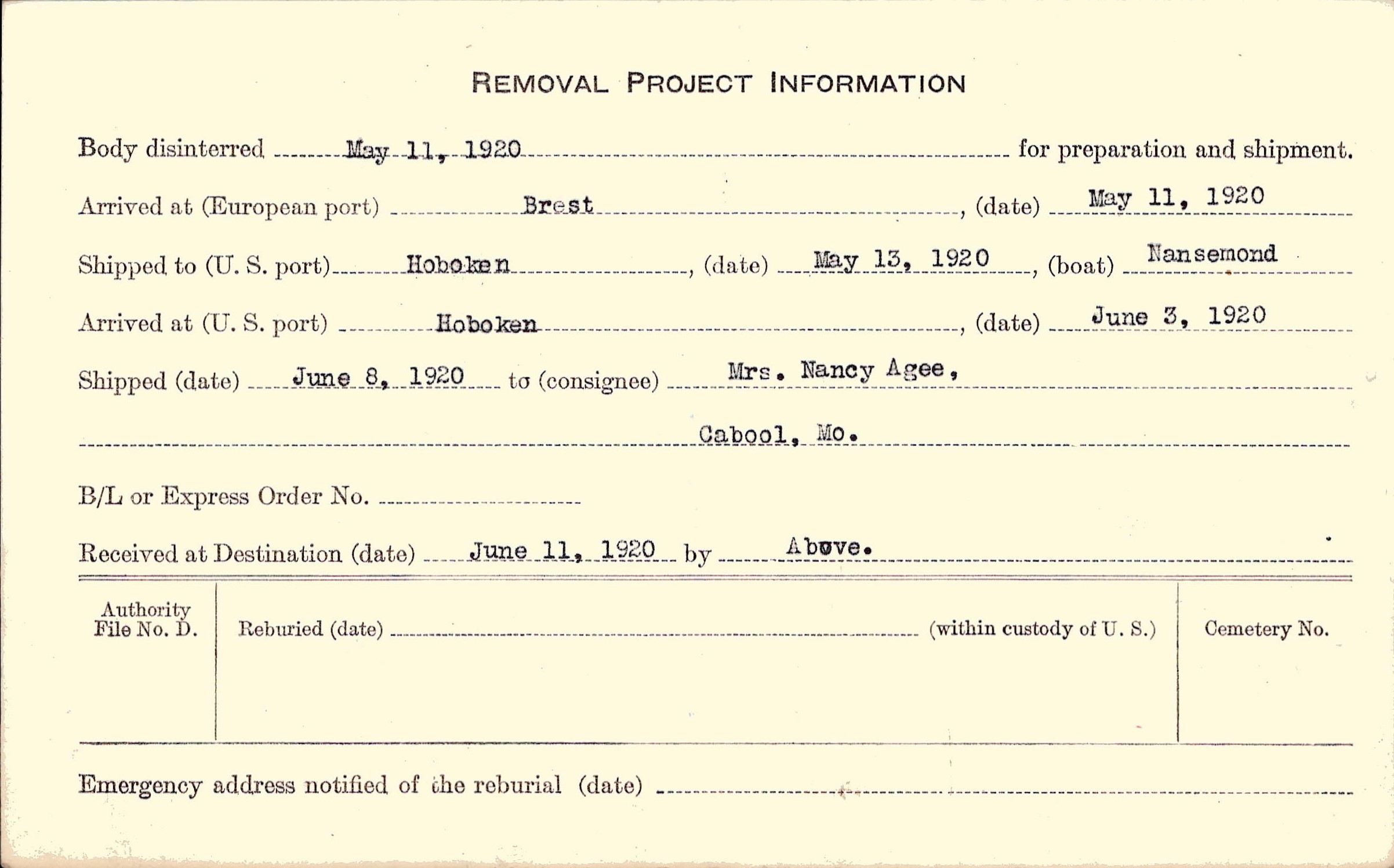 Body disinterred 5/11/1920 for preparation and shipment.
