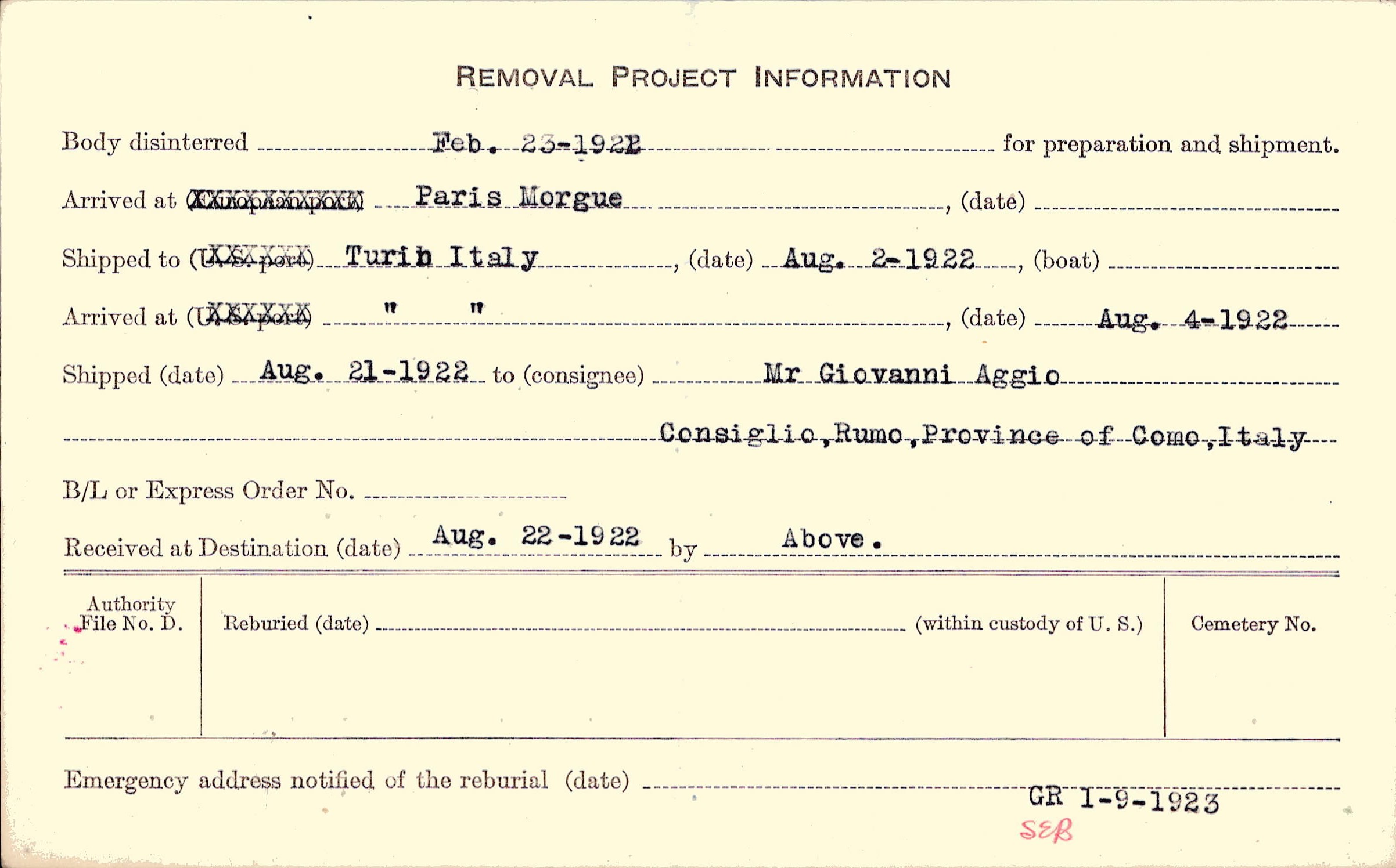 Body disinterred 2/23/1922 for preparation and shipment.