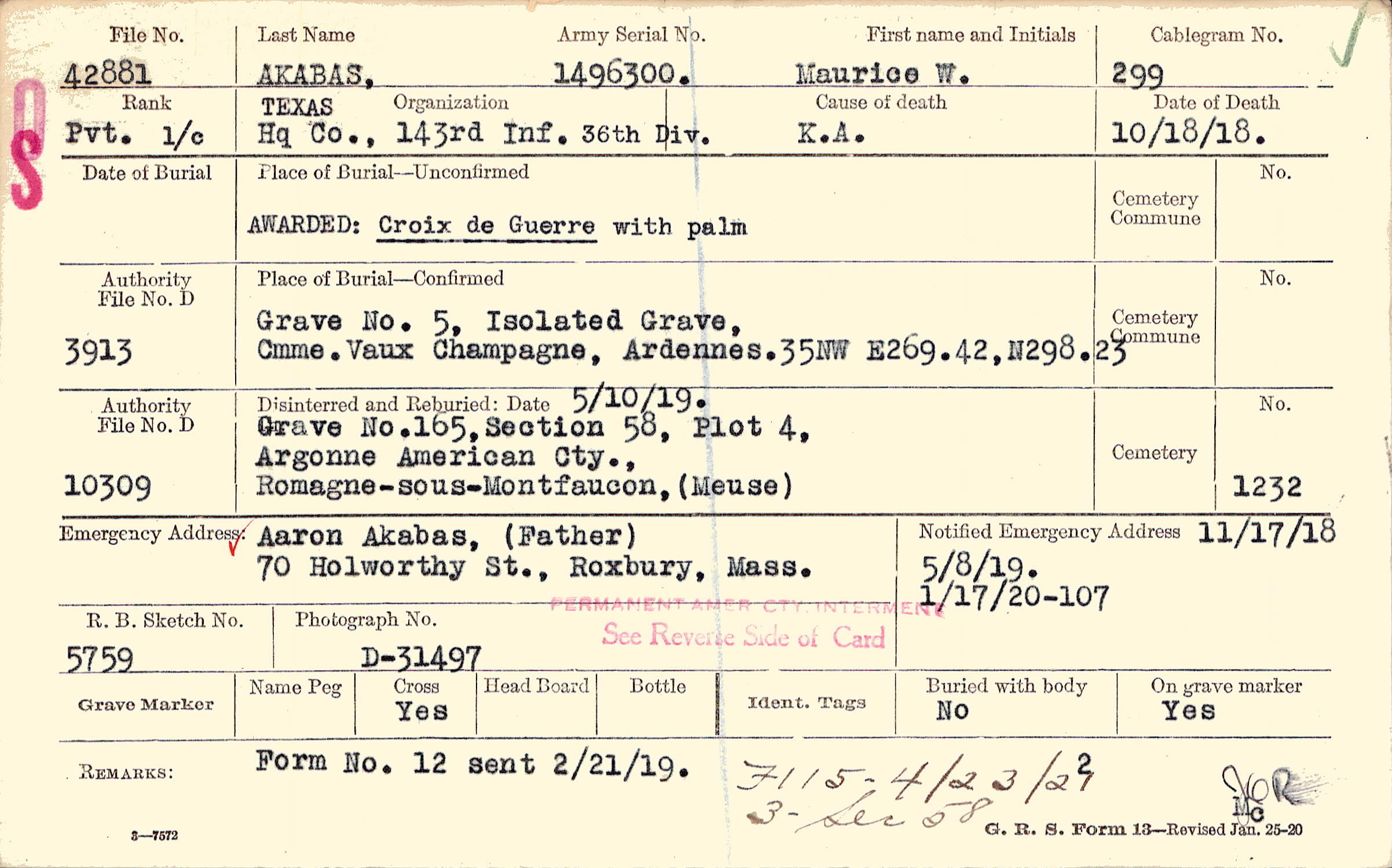Aaron Akabas, (Father), 70 Holworthy St. , Roxbury, Mass.