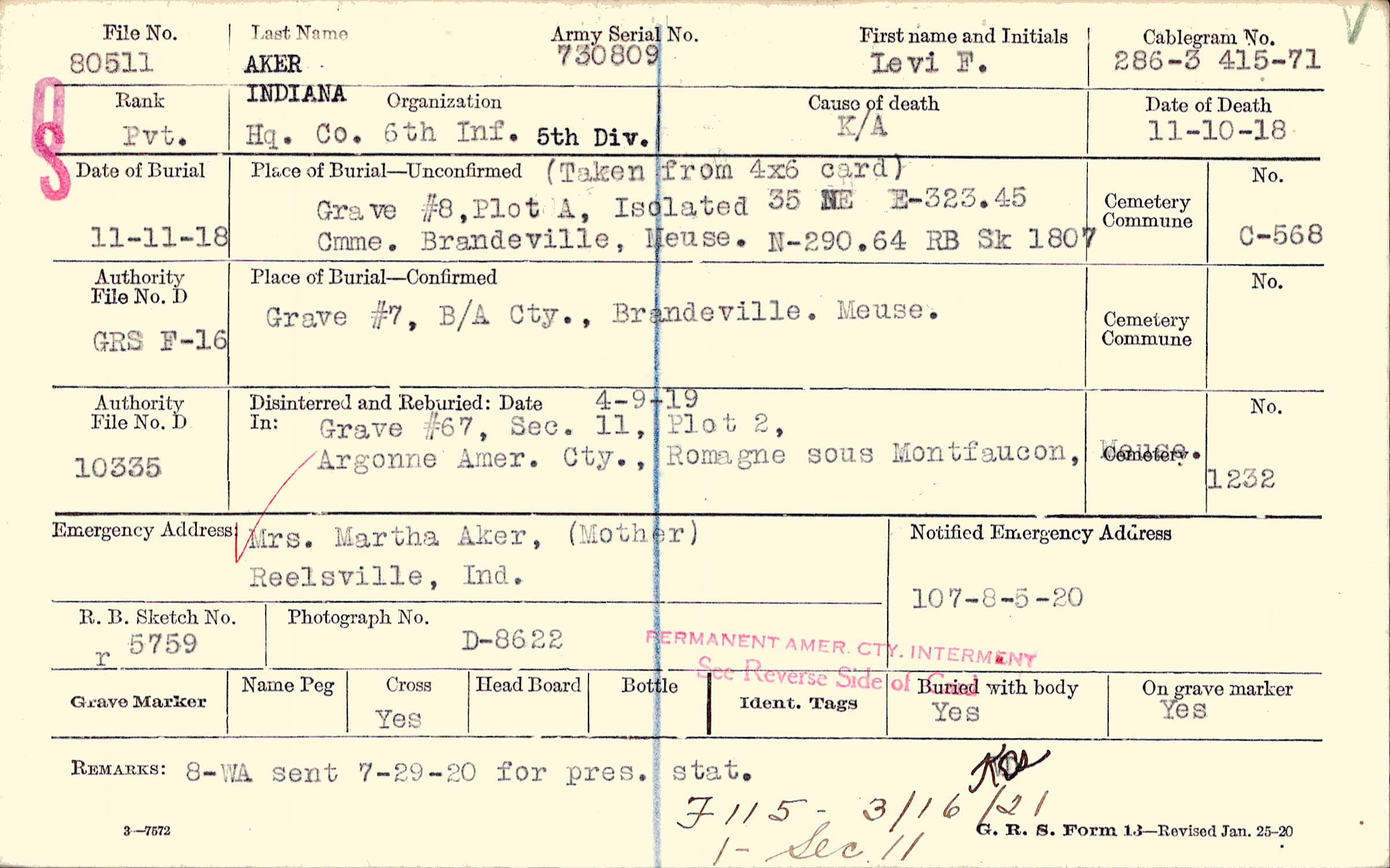 Grave #8, Plot A, Isolated, 35 NE, Cmme. Brandeville, Meuse., RB Sk 1807