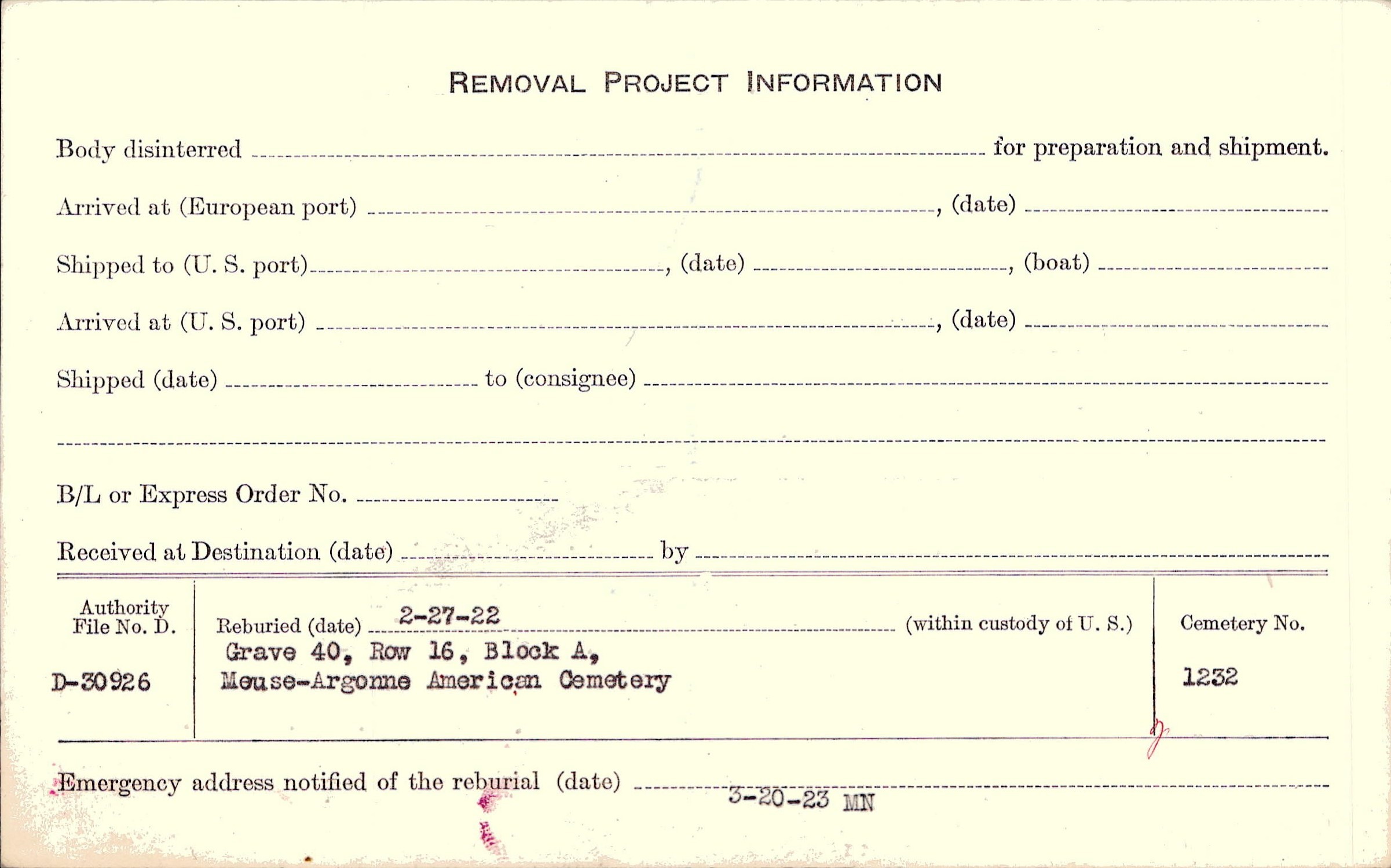 | Permanent Burial in Foreign Cemetery |