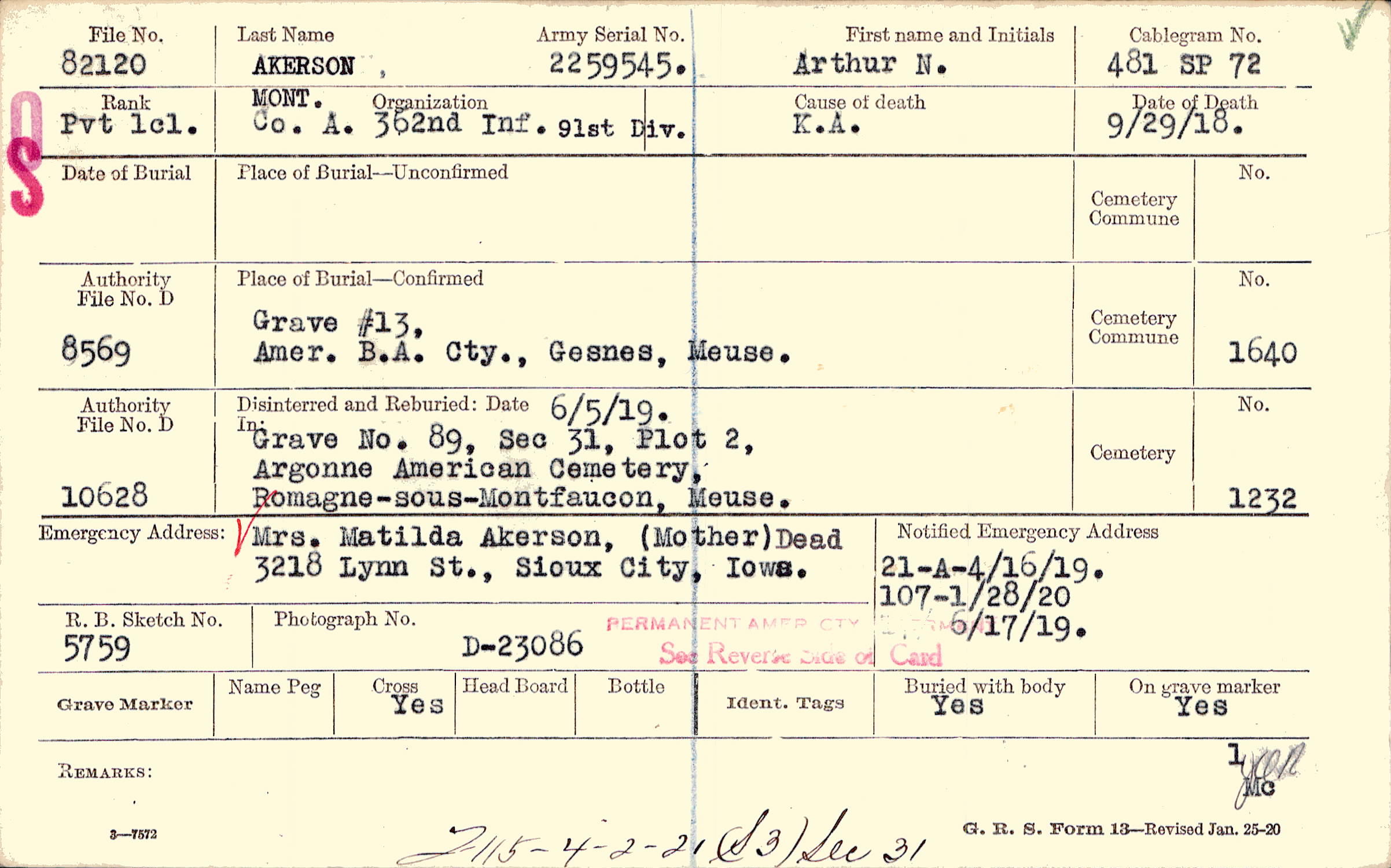 Mrs. Matilda Akerson, (Mother) Dead, 3218 Lynn St., Sioux City, Iowa., Dead