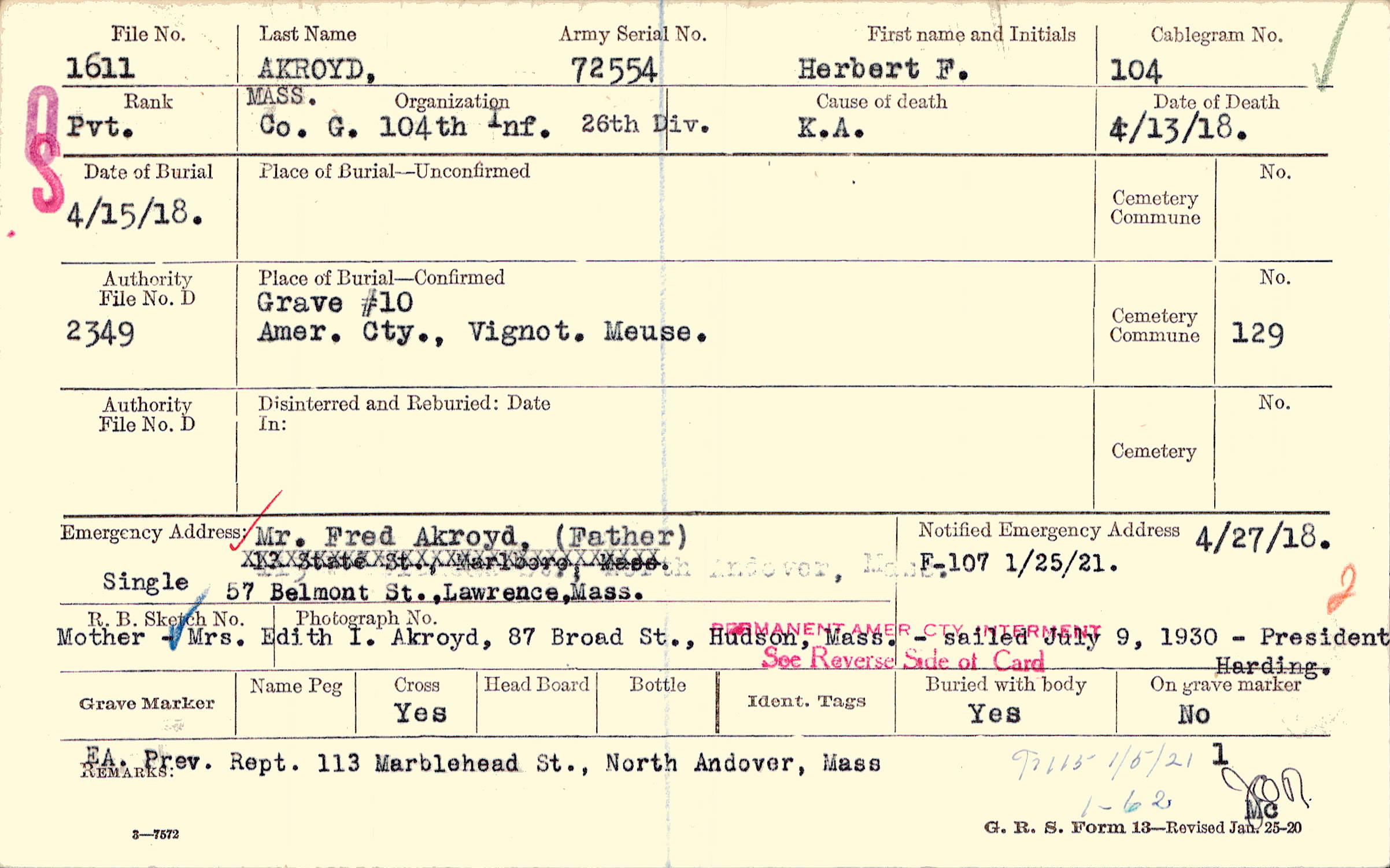 Mr. Fred Akroyd, (Father), 57 Belmont St.,Lawrence,Mass., Single Mother - Mrs. Edith I. Akroyd, 87 Broad St., Hudson, Mass. - sailed July 9, 1930 - President Harding.
