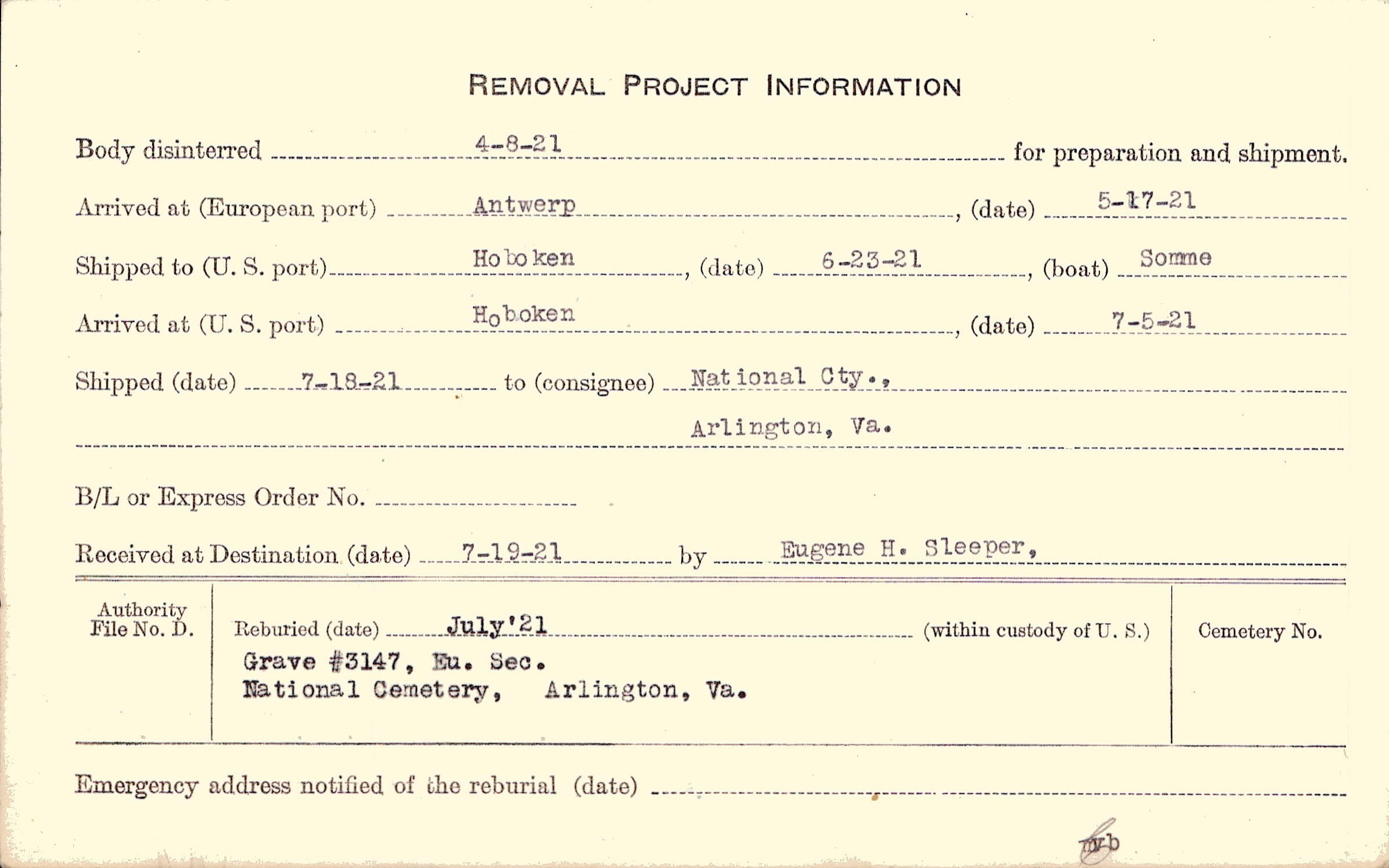 Body disinterred 4/8/1921 for preparation and shipment.