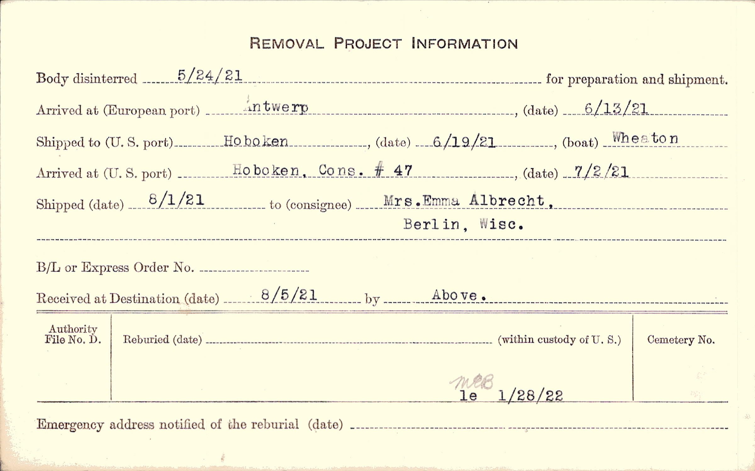Mrs. Emma Albrecht. (Mother), 1410 Washington St., Berlin, Wisc.