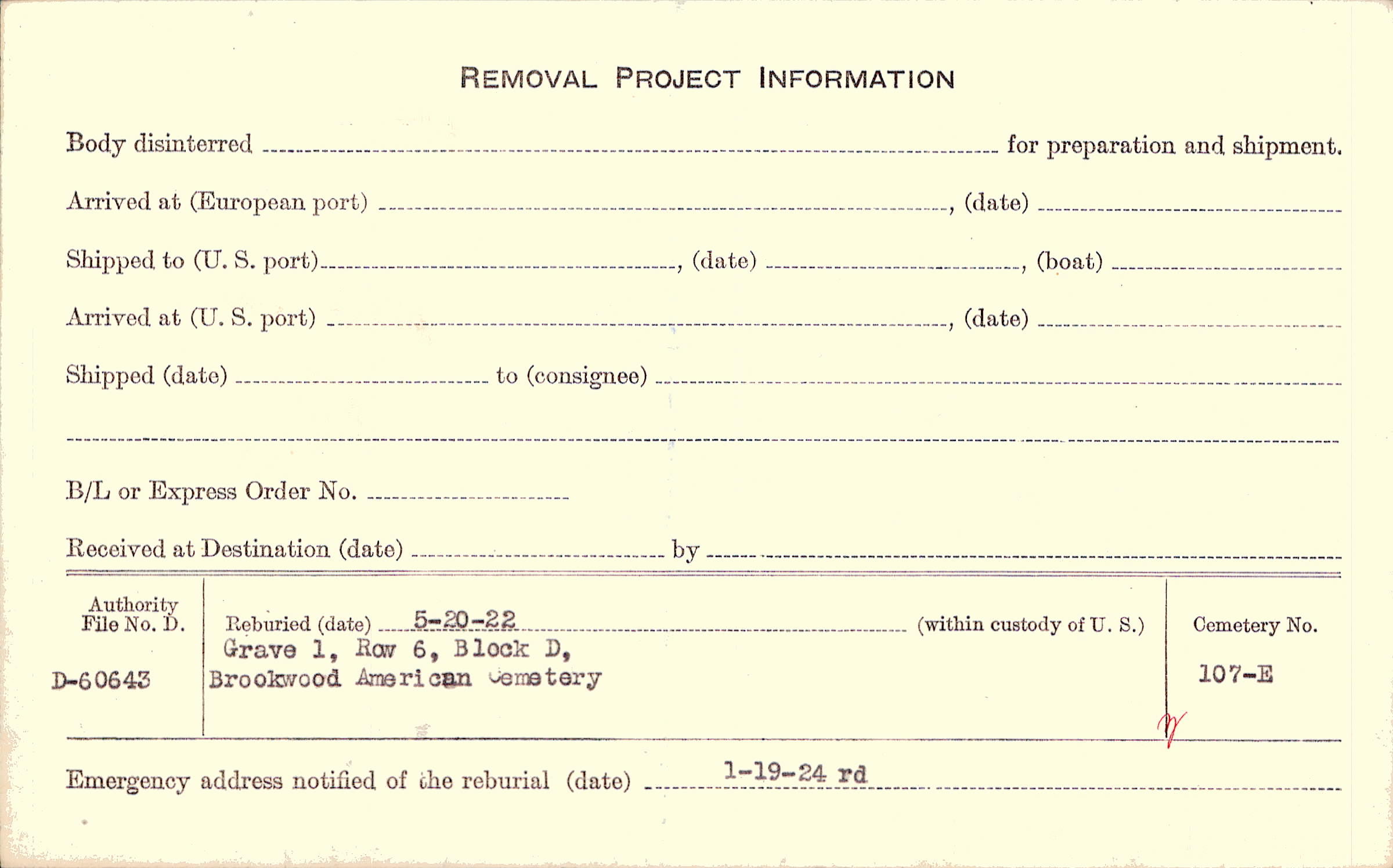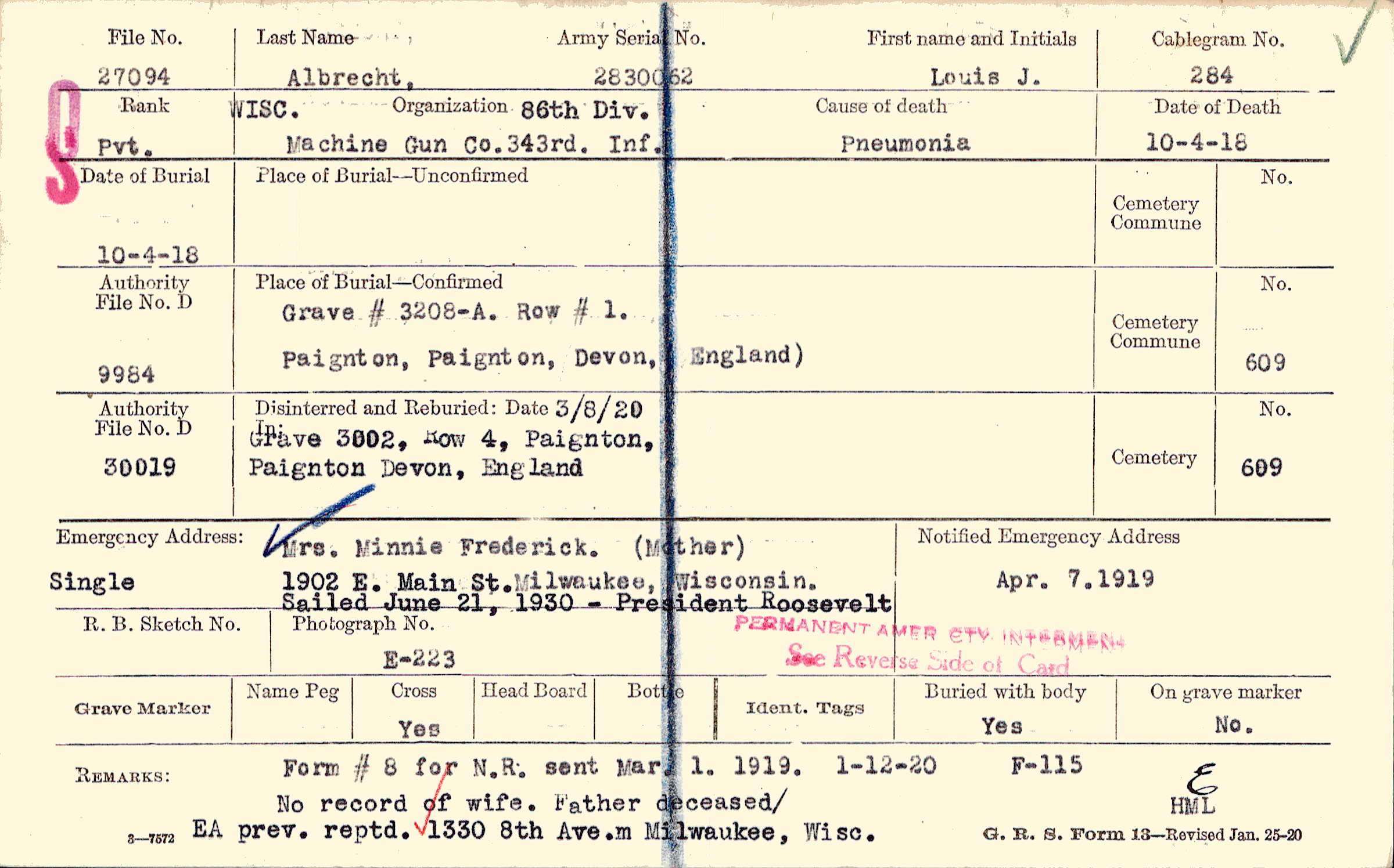 No record of wife. Father deceased/ EA prev. reptd. 1330 8th Ave.m Milwaukee, Wisc., Form # 8 for N.R. sent Mar. 1. 1919.
