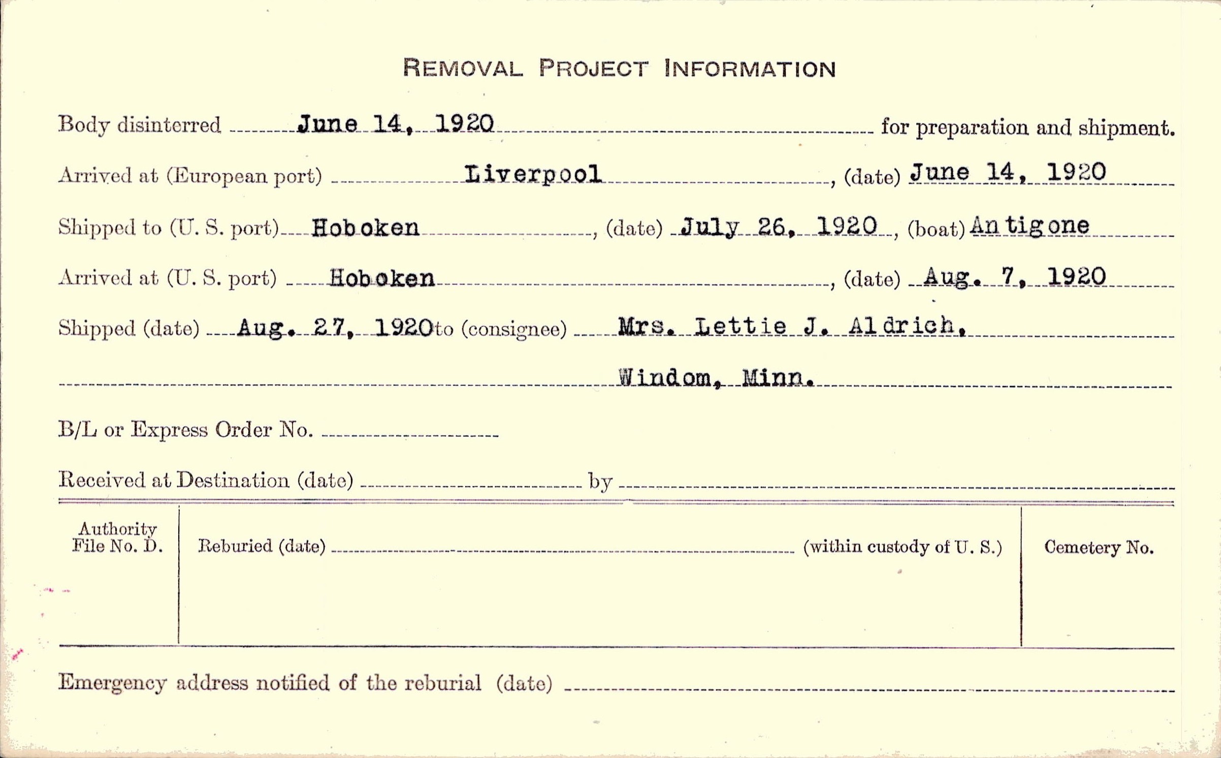 Body disinterred 6/14/1920 for preparation and shipment.