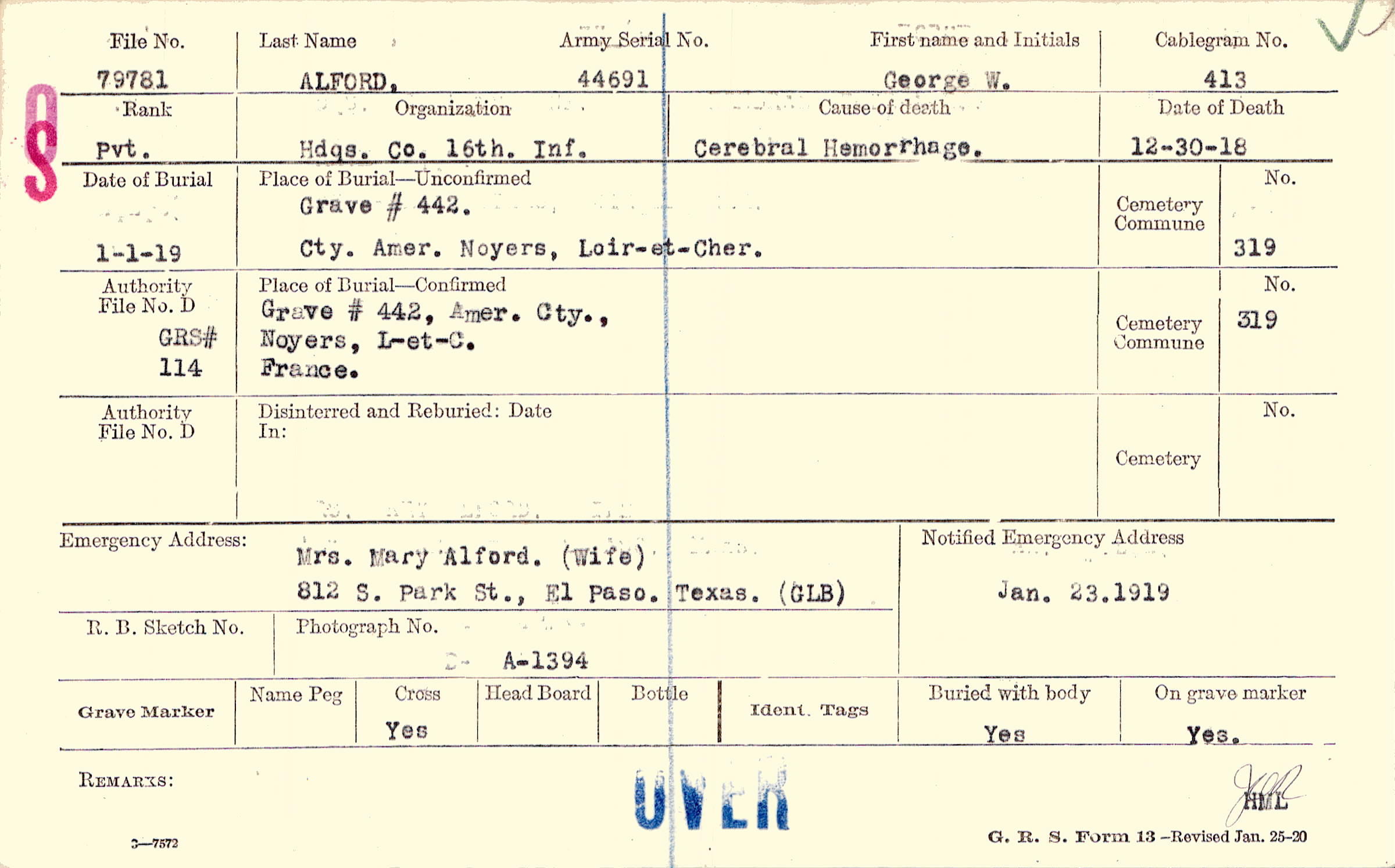 Mrs. Mary Alford. (Wife), 812 S. Park St., El Paso. Texas., (GLB)