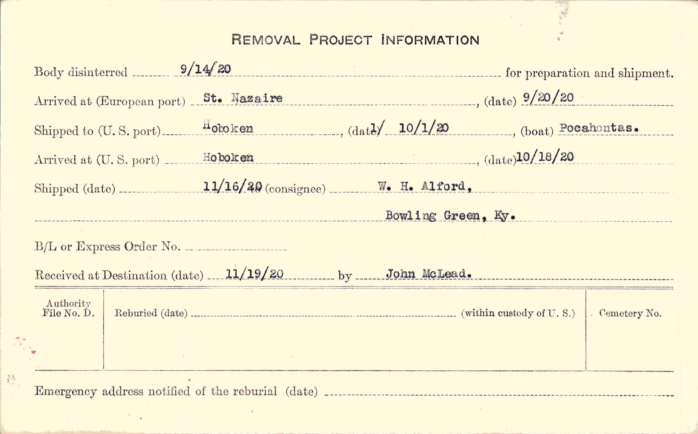 Body disinterred 9/14/1920 for preparation and shipment.